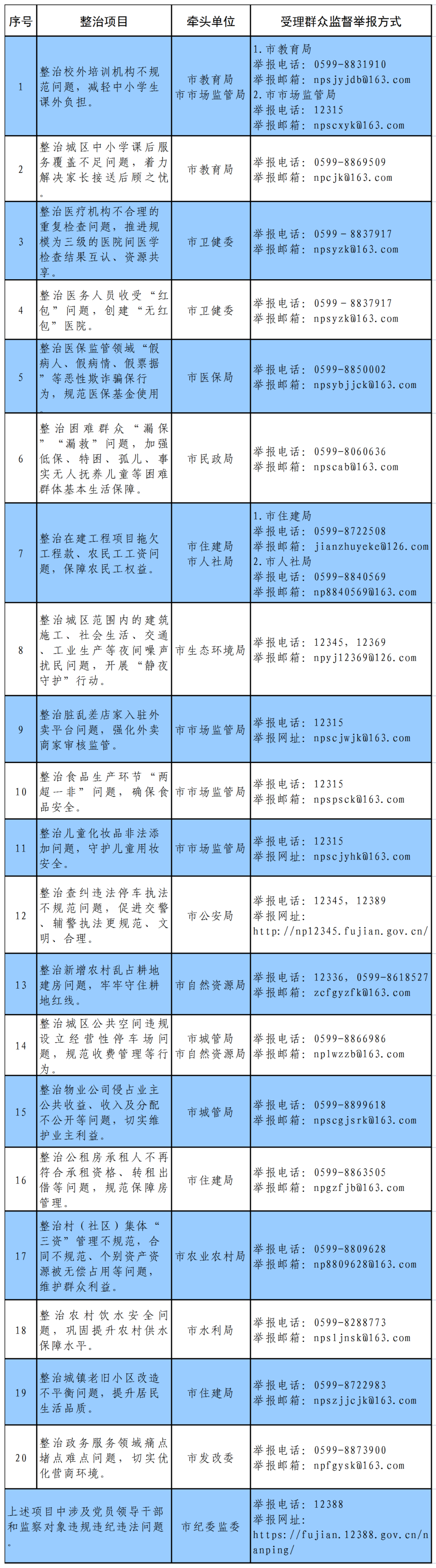 為方便群眾參與監(jiān)督和反映問題,現(xiàn)將20項“點題整治”項目及受理群眾監(jiān)督舉報方式公布如下: