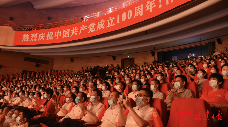 夜幕下,南平大劇院流光溢彩、美輪美奐。演出開始前,劇場外即上演了熱場演出,現(xiàn)場觀眾在進場前也紛紛與展板合影留念,表達著對中國共產(chǎn)黨百年華誕的喜慶祝福。