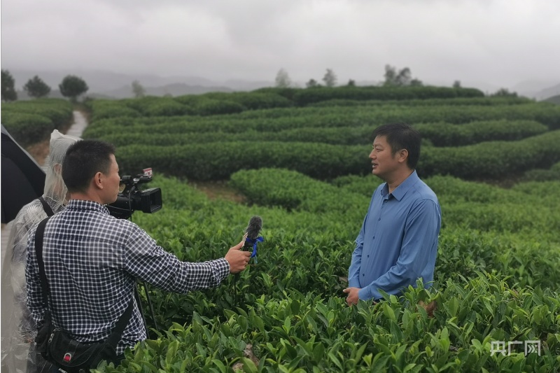 記者雨中采訪白茶基地負責人(央廣網(wǎng)發(fā) 寒溫攝)