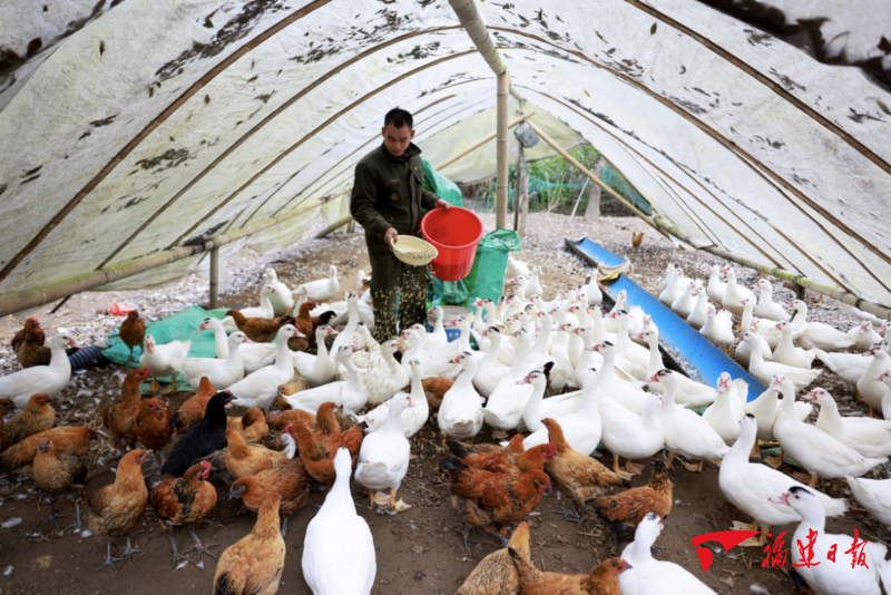 養(yǎng)殖戶利用加工好的菌草飼料喂養(yǎng)雞鴨。(徐華山 攝)