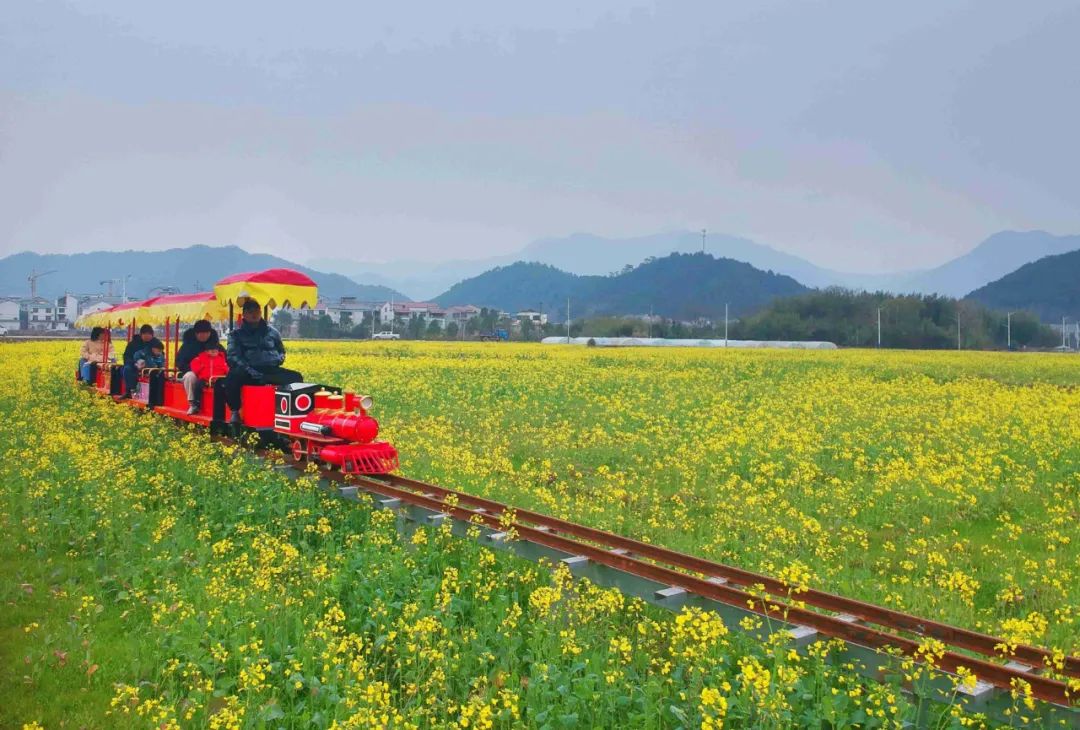 ▲游客在武夷山五夫鎮(zhèn)搭乘朱子小火車穿越油菜花海。(黃杰敏 攝)
