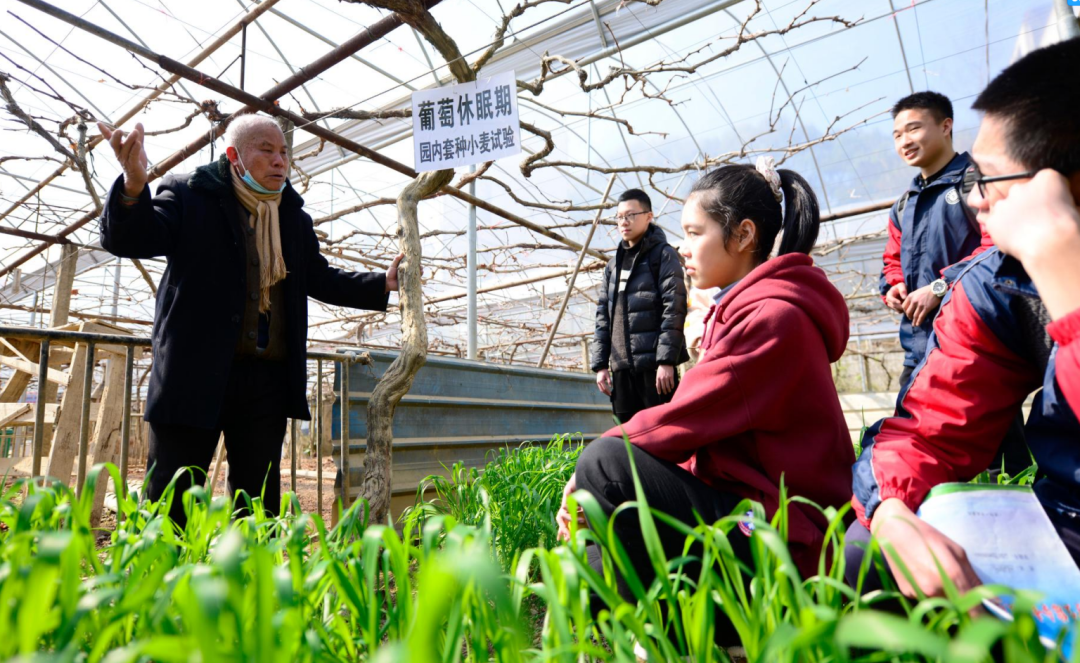 ▲在建陽區(qū)考亭村的鑒湖葡萄品種園,八旬高齡的科技特派員謝福鑫為建陽一中的同學們上了一場別開生面的“農(nóng)藝體驗課”,帶著同學參觀了葡萄休眠期園內(nèi)套種小麥實驗,講解了葡萄、桔柚等作物的栽培和剪枝技巧。(張行健 攝)