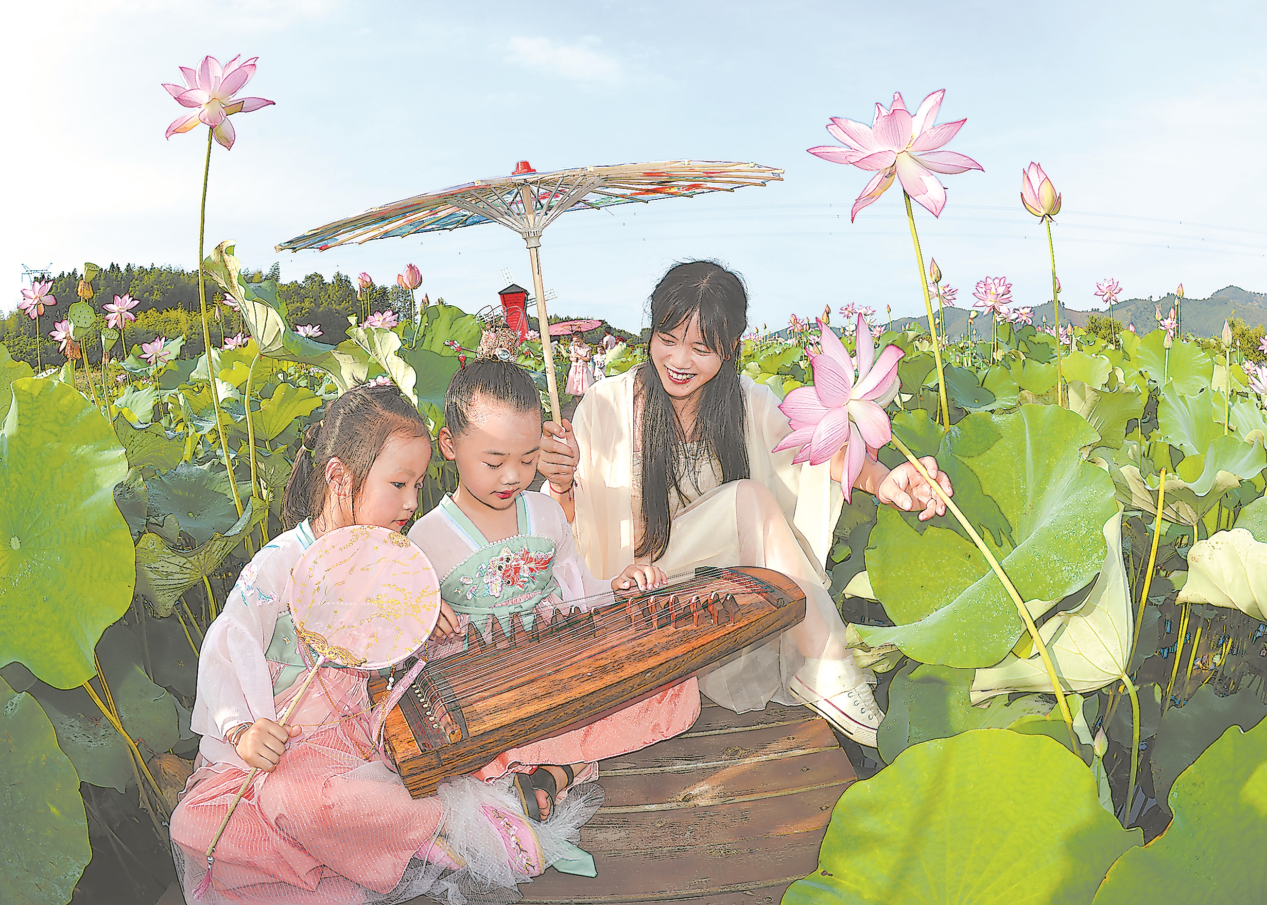 在荷塘中彈奏古箏,曲聲悠揚(yáng),鮮花搖曳。