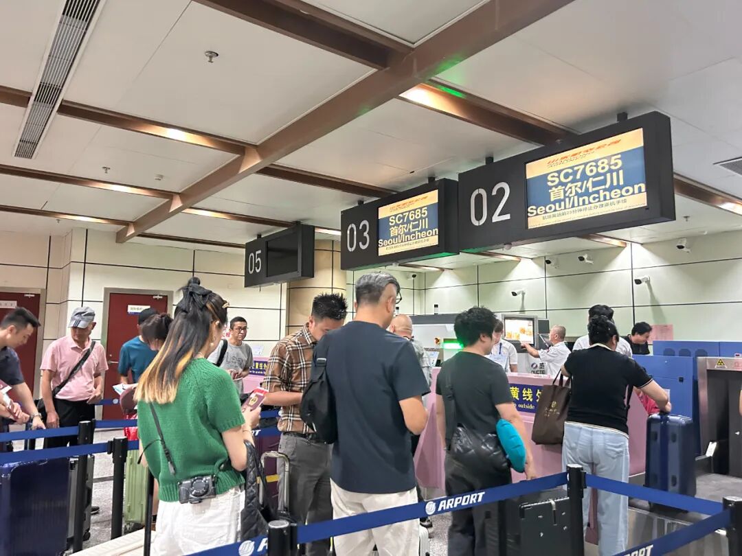 前往韓國(guó)的旅客正在武夷山機(jī)場(chǎng)辦理乘機(jī)手續(xù)(張?bào)阆?攝)