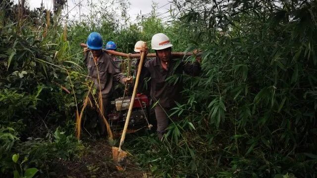 有些山路崎嶇機(jī)械無(wú)法到達(dá)。1.1噸的電桿,15米的距離,人工立桿作業(yè)就要1個(gè)多小時(shí)。(黃朝增/拍攝)