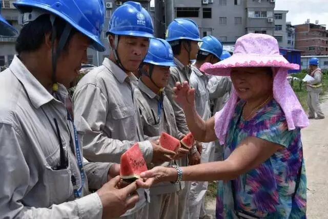 群眾為在利埕線(xiàn)148桿斷桿搶修的國(guó)網(wǎng)莆田供電公司作業(yè)人員送上西瓜解暑。(鄭劍洪/攝)