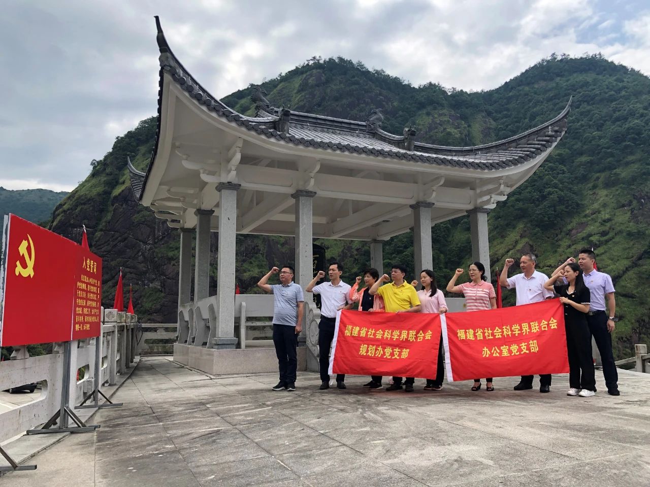 圖為省社科聯(lián)黨員干部在百丈巖戰(zhàn)斗遺址重溫入黨誓詞