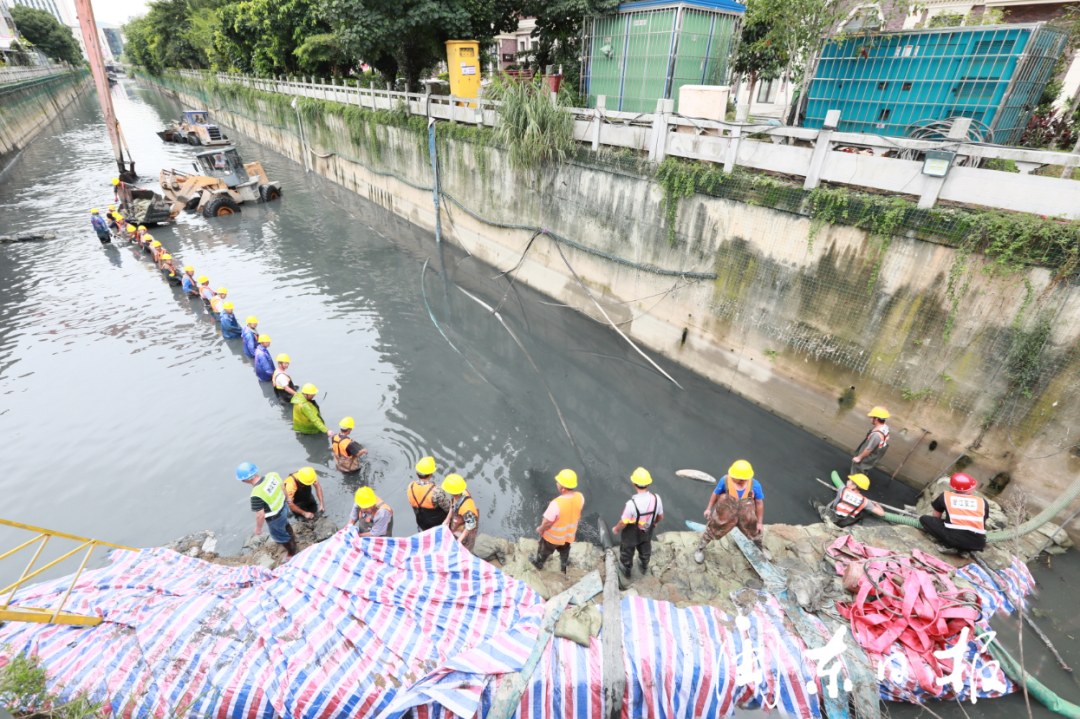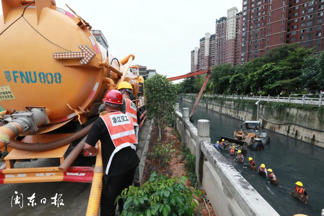 10月6日,在寧德中心城區(qū)南大塘河道上,幾十名工人正在開展清淤作業(yè)。國慶假期,在寧德中心城區(qū)水系綜合治理工程中,每天都有1000多名工人活躍在城區(qū)內的60多個工作面,全力推進工程進度。 記者 鄭霄 攝