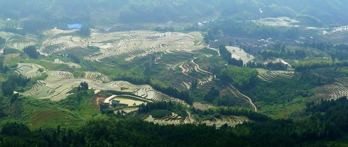 特別是夕陽照射下的田埂,層層疊疊從座座山頭延展而下,叫人不禁嘆出:“如道道金鏈、滾層層綠波、疊座座金山、鎖條條蒼龍”。