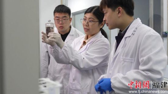 葉周敏(右一)與閩江學(xué)院科研團(tuán)隊(duì)進(jìn)行海參肽研究。