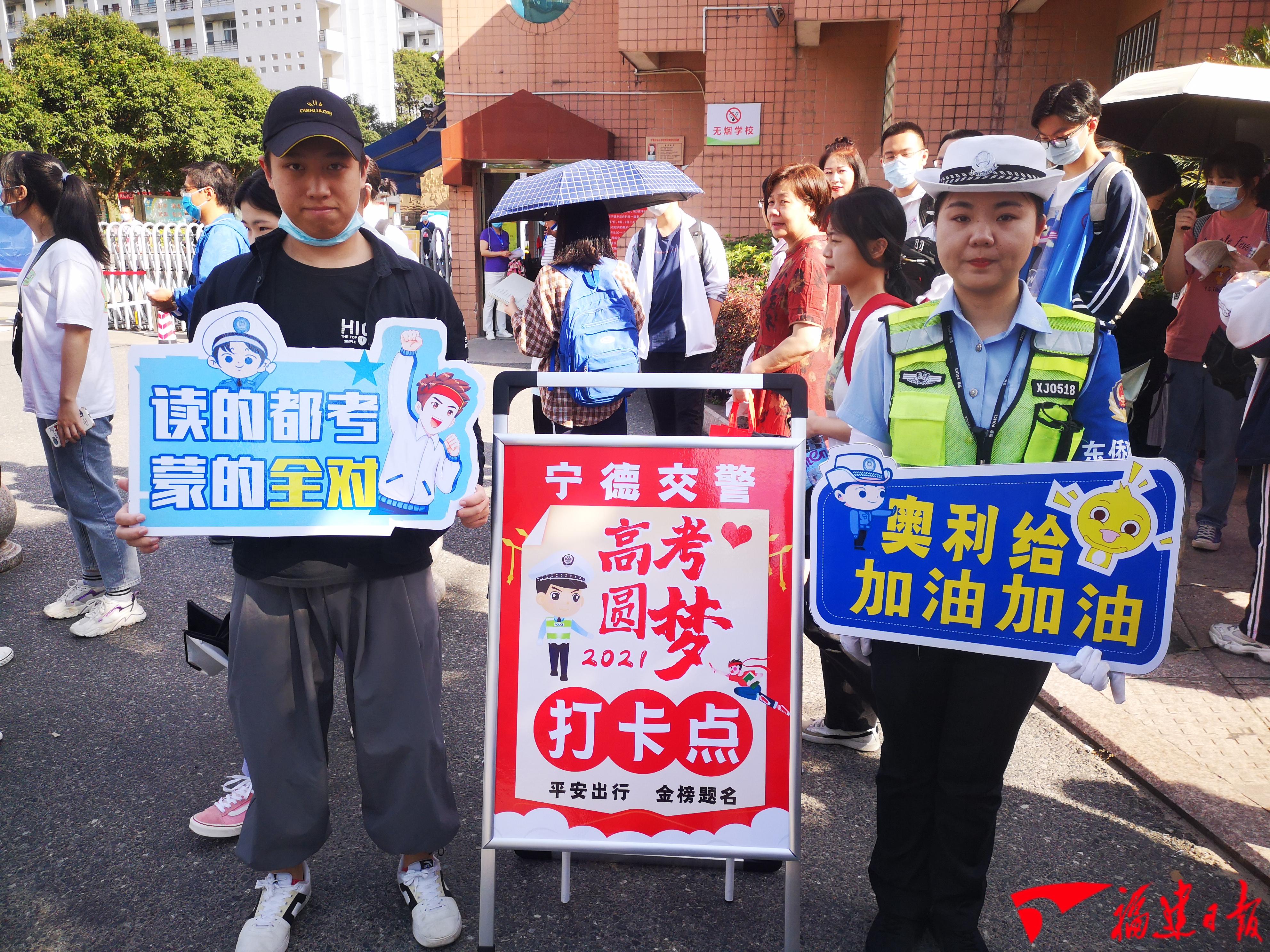 7日一大早,寧德公安交警部門就在城區(qū)各個考場門口設(shè)立了“高考圓夢打卡點(diǎn)”,讓考生及家長拿著有趣幽默的祝福標(biāo)牌合影,放松考生情緒,營造輕松加油的正能量心理暗示,博個好彩頭,祝他們考試順利。