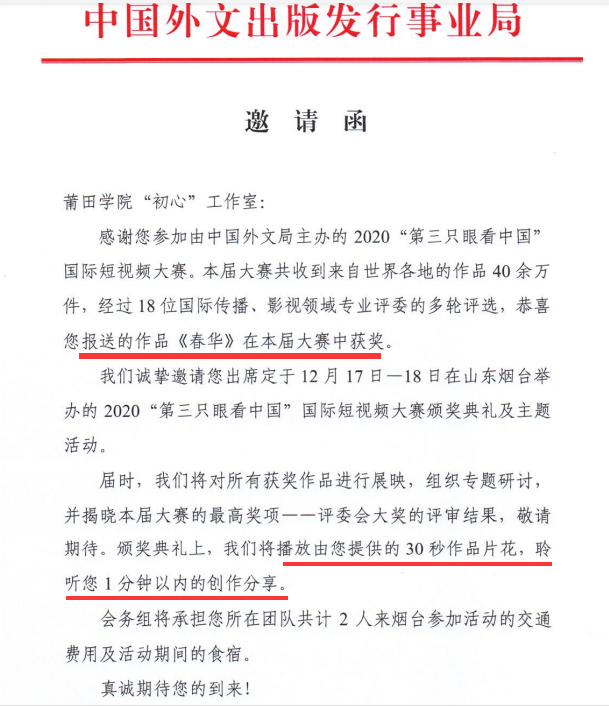 臺海網(wǎng)12月19日訊 據(jù)福建日報·新福建APP報道 17日晚,在山東煙臺落幕的2020“第三只眼看中國”國際短視頻大賽頒獎典禮上傳來喜訊,由莆田學(xué)院“初心”工作室選送的短視頻《春華》榮獲大賽優(yōu)秀作品獎。視頻通過莆田學(xué)院印尼留學(xué)生曾羅伊的視角,展現(xiàn)了莆田仙游縣郊尾鎮(zhèn)伍獅村的鄉(xiāng)土人文風(fēng)貌。這也是莆田高校首次在國際短視頻大賽中獲獎。