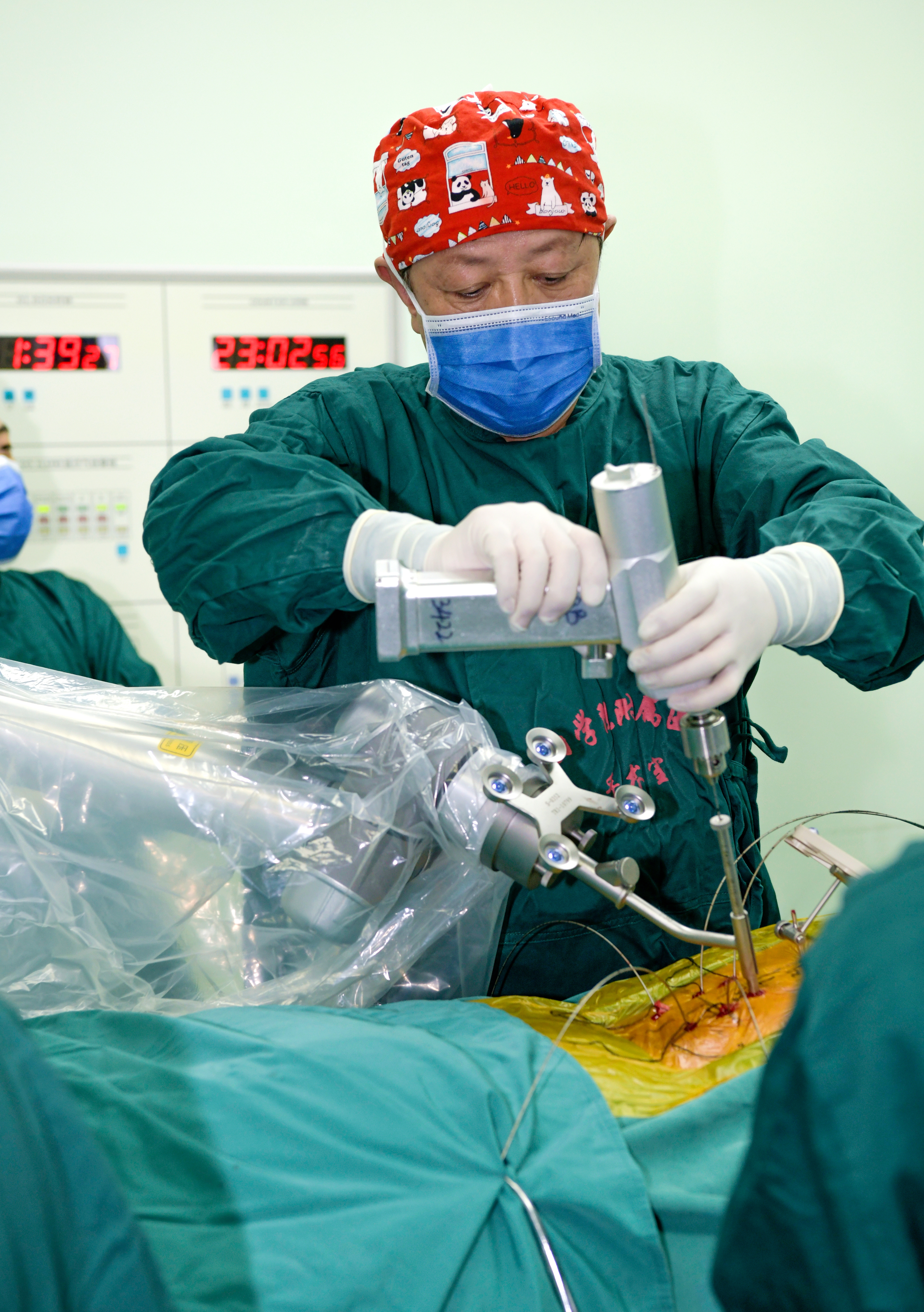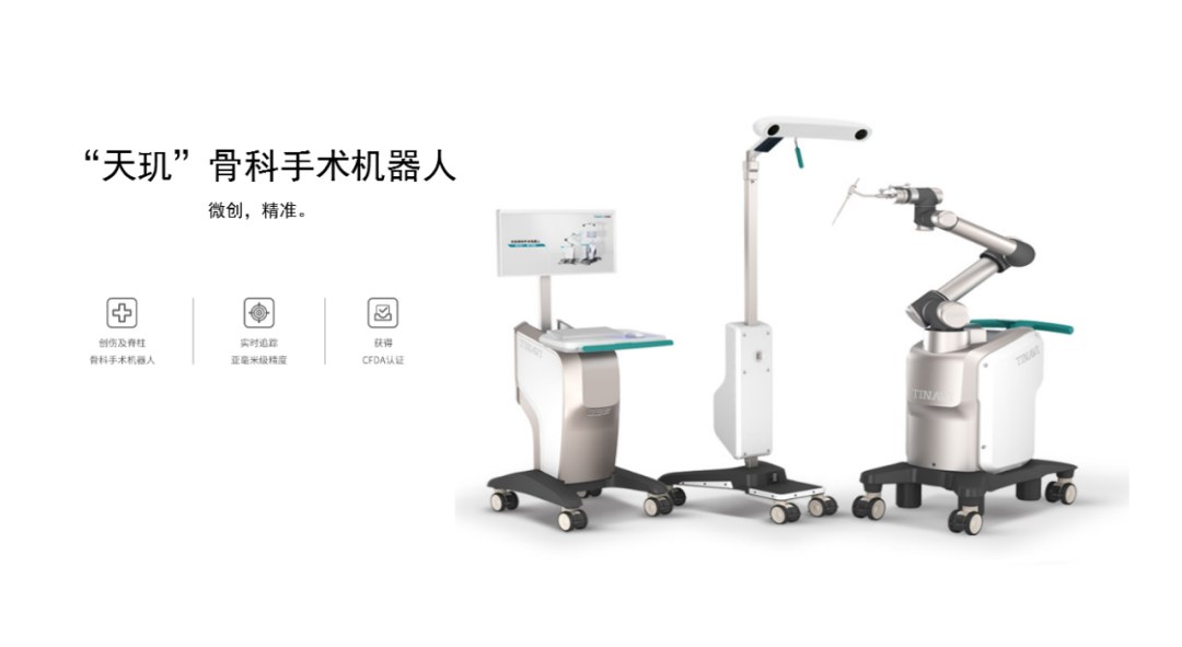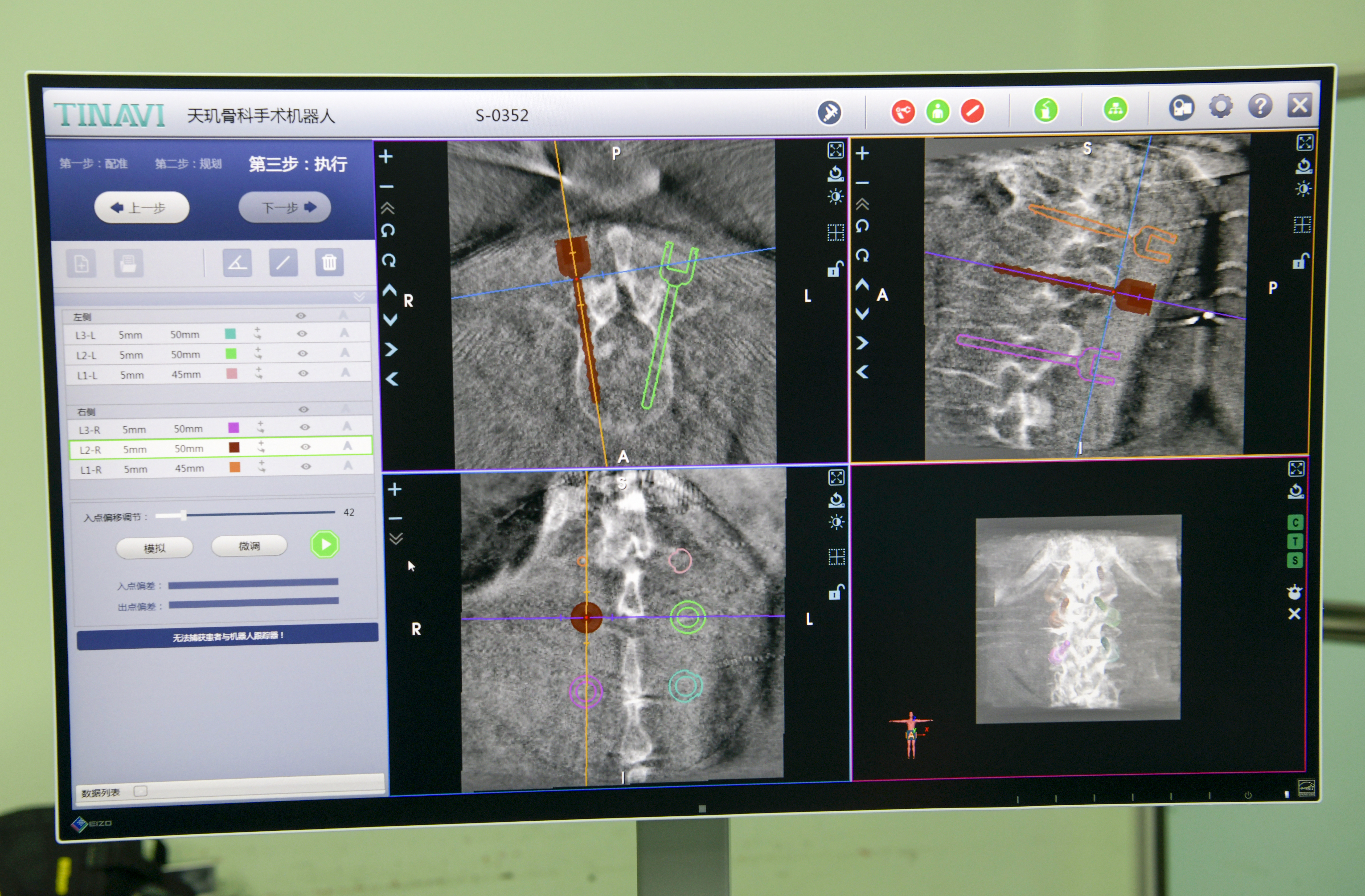 據(jù)了解,“天璣”骨科手術(shù)機器人,是目前國際上唯一可以開展頸、胸、腰、骶椎全脊柱及骨盆、四肢創(chuàng)傷骨折手術(shù)的機器人系統(tǒng),由機械臂主機、光學跟蹤系統(tǒng)、主控臺車構(gòu)成。林海濱教授介紹說,“天璣”獨有的“透視眼”和“穩(wěn)定手”,等于給醫(yī)生裝上了“透視眼”和“第三只手”,解決了目前骨科手術(shù)遇到的視野差、精準難、不穩(wěn)定等三大難題。主控電腦系統(tǒng)等同于機器人的大腦,幫助醫(yī)生進行“術(shù)前規(guī)劃”,同時智能傳達主刀醫(yī)生的思路給以上兩個設備,并跟蹤患者術(shù)中的移動,做相應自動補償,保障手術(shù)規(guī)劃路徑與計劃路徑高度一致。