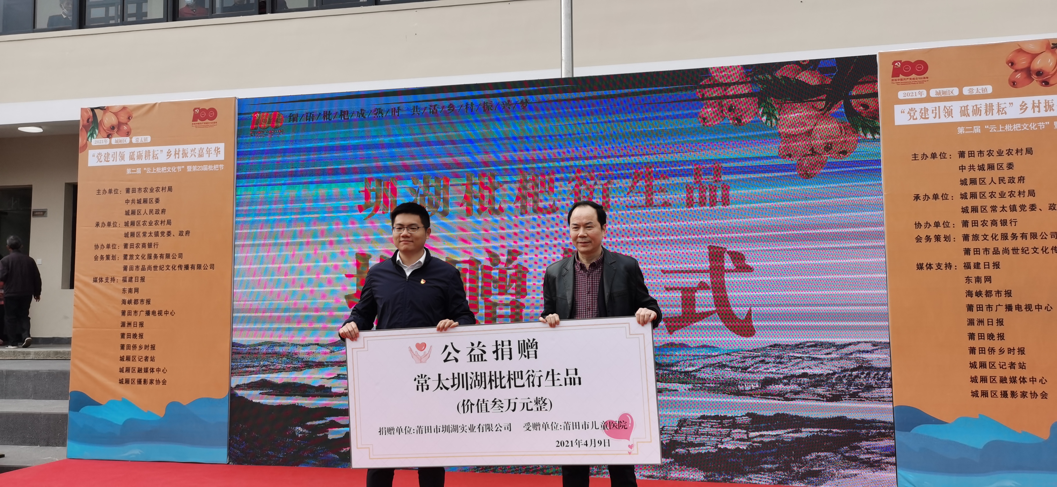 最美人間四月天,愛心捐贈暖心間。當天,常太鎮(zhèn)向莆田市兒童醫(yī)院贈送了價值3萬元的圳湖枇杷衍生品--果干、果醬等產(chǎn)品。