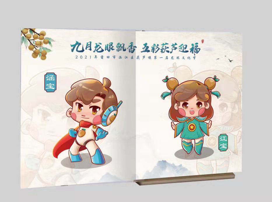 本次涵江萩蘆龍眼文化節(jié)推出涵江龍眼吉祥物IP:涵寶和江寶一男一女兩枚形象。以龍眼為原型,結(jié)合涵江區(qū)第十次黨代會提出的“打造現(xiàn)代農(nóng)產(chǎn)業(yè)強(qiáng)區(qū)、建設(shè)生態(tài)宜居涵江”為主題,男的取名為涵寶,其高科技機(jī)械風(fēng)格體現(xiàn)了涵江工業(yè),搭配藍(lán)色風(fēng)格,是生態(tài)水韻涵江與現(xiàn)代產(chǎn)業(yè)涵江并重發(fā)展的體現(xiàn)。女的取名為江寶,其中龍眼、燕尾脊元素搭配綠色風(fēng)格,體現(xiàn)涵江綠水青山、歷史文化風(fēng)貌,凸顯涵江生態(tài)宜居整體面貌。