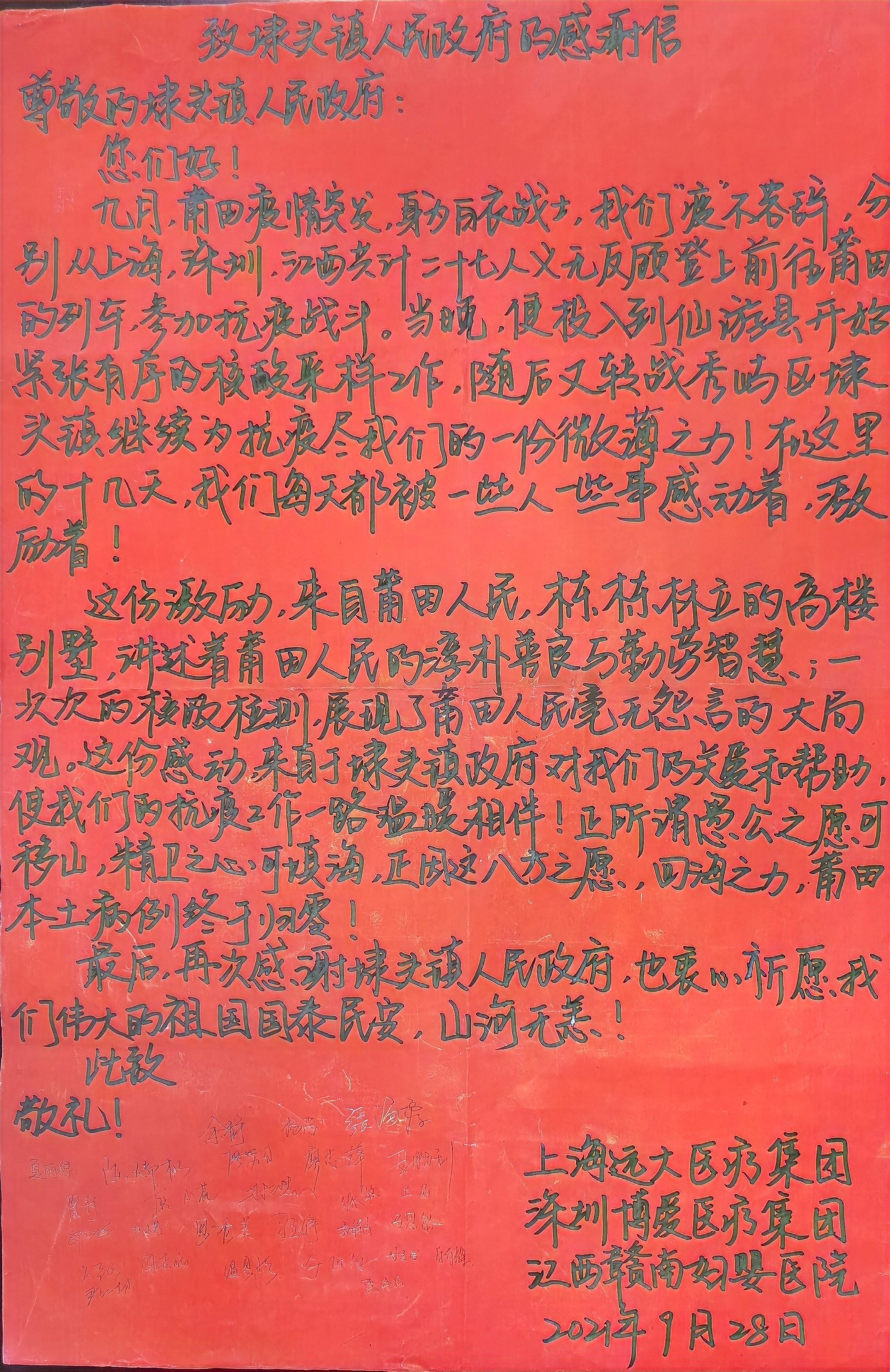 “9月15日我們一行27人就到位了,當(dāng)晚出征仙游度尾鎮(zhèn),16日開展核酸采樣4500多人份,17日轉(zhuǎn)戰(zhàn)秀嶼區(qū)埭頭鎮(zhèn)、東莊鎮(zhèn)至今,當(dāng)?shù)卣疄榘滓绿焓箓兡軌蝽樌ぷ魈峁┝藦?qiáng)有力的后勤保障。我們深深地感受到了莆田人民的淳樸和善良,感受到了莆田人民政府對(duì)抗疫隊(duì)伍的關(guān)心,也感受到了莆田人團(tuán)結(jié)的力量!更加感受到秀嶼人民不畏艱險(xiǎn)和風(fēng)雨同舟的精神!”電話連線中,深圳博愛醫(yī)療集團(tuán)陳瑞松道出了寫感謝信的初衷。