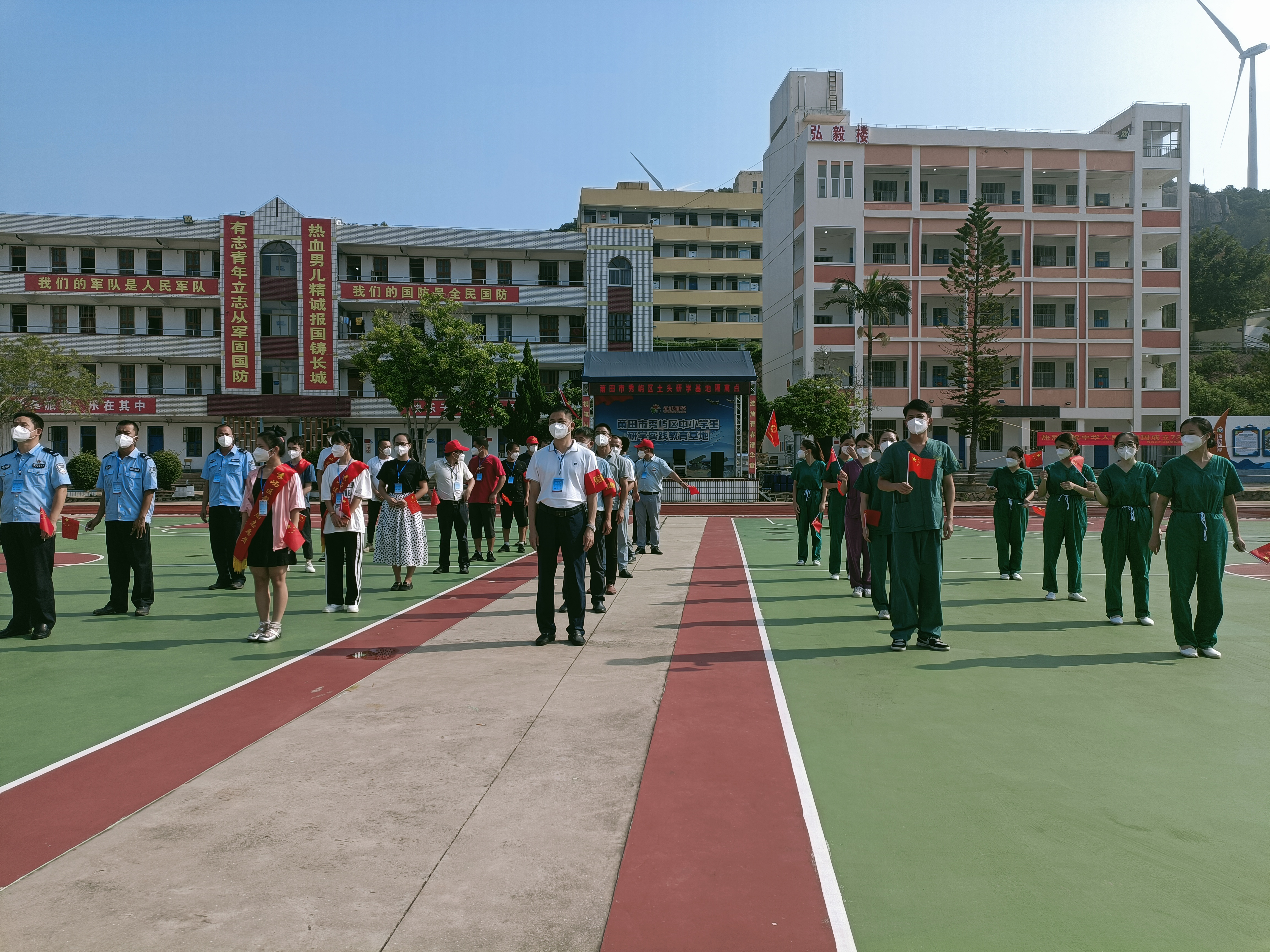 寬闊的操場上,50位駐點人員嚴(yán)格按照疫情隔離防護(hù)要求,佩戴醫(yī)用口罩,保持一米以上安全距離,整齊列隊等待。隔離房內(nèi),58位留觀人員衣著整潔,小朋友們則戴上了鮮艷的紅領(lǐng)巾,大家望向窗外,一起等待著那莊嚴(yán)時刻的到來。