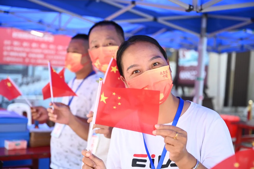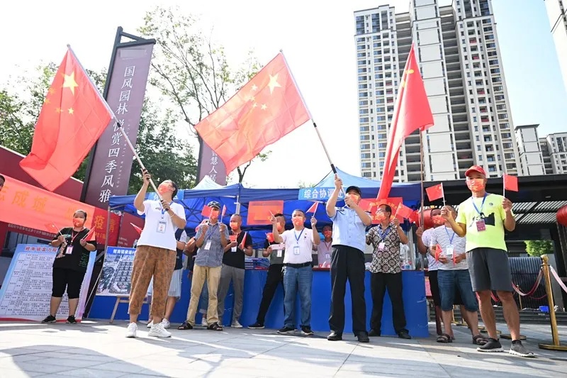 10月1日國慶節(jié),駐扎在該小區(qū)執(zhí)勤人員佩戴紅口罩,現(xiàn)場紅旗飄揚。