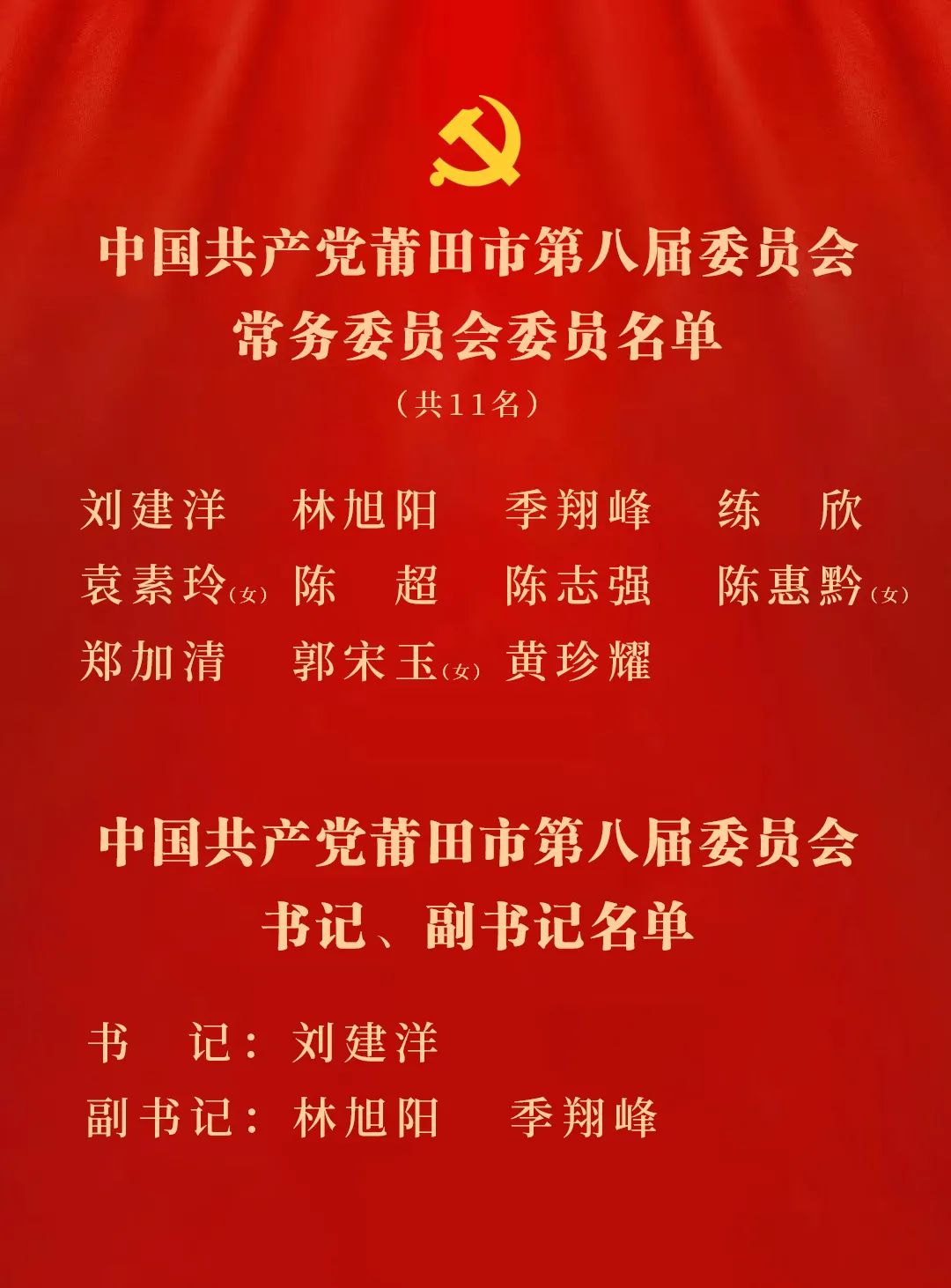 會(huì)議選舉產(chǎn)生了中共莆田市第八屆委員會(huì)常務(wù)委員會(huì)委員11名,書(shū)記1名,副書(shū)記2名。
