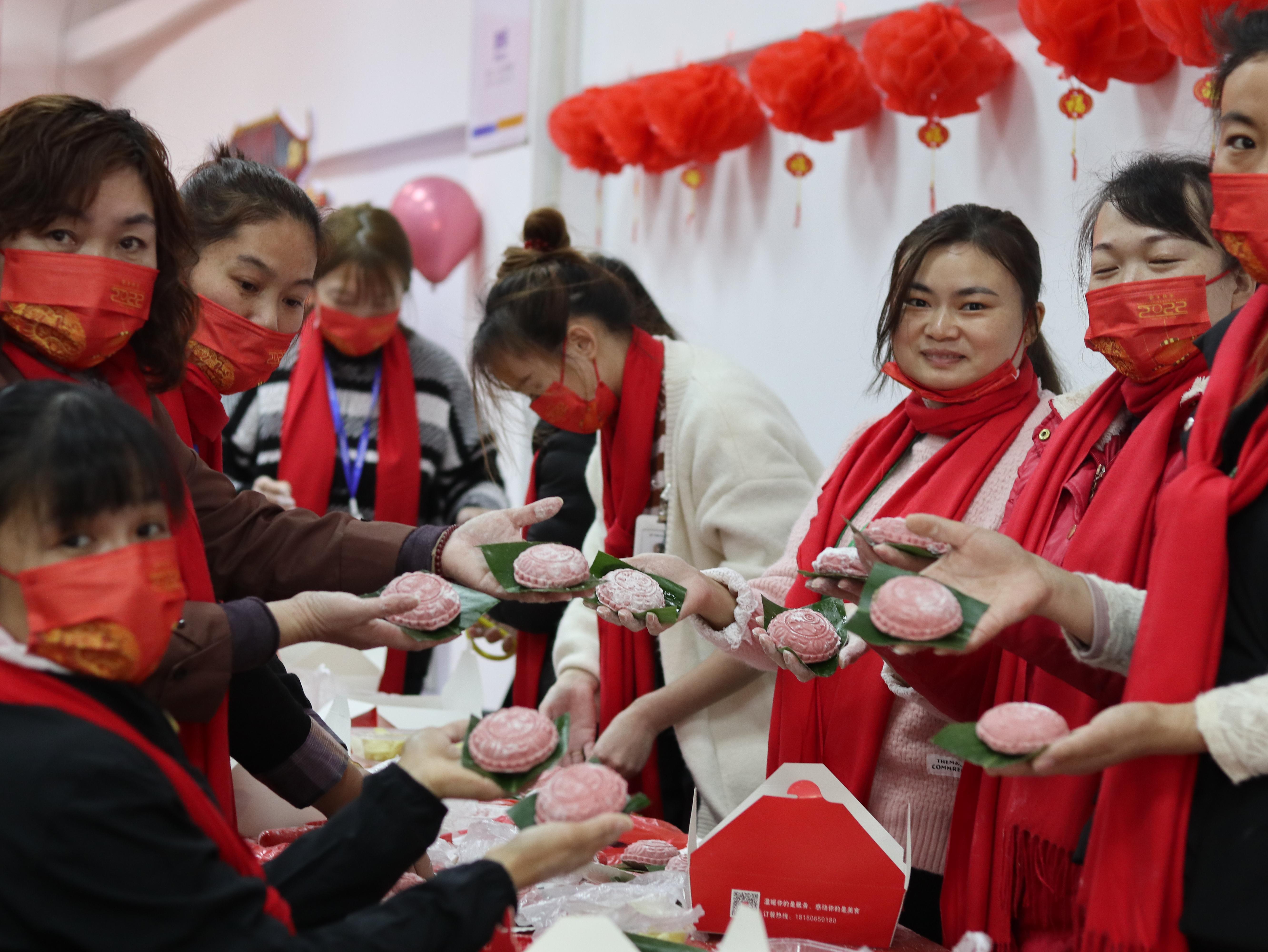 一枚印上歸期的車票,是忙碌一年中最迫切的期盼。在穩(wěn)定疫情和回家團(tuán)圓之間,女工們選擇就地過年,為了讓她們能在第二故鄉(xiāng)感受到熱騰騰的年味,莆恬寶媽準(zhǔn)備了鍋邊糊、小麻花等莆仙特色美食與大家共享舌尖上的年味。現(xiàn)場,大家還一起動手制作莆田特色小吃“紅團(tuán)”,近距離認(rèn)識莆田獨(dú)特的民俗文化,體驗(yàn)過年的喜慶氛圍。