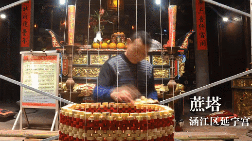 涵江區(qū)延寧宮中,村民們將甘蔗去皮,削成厚度僅有一至兩厘米的蔗塊,堆砌成三米多高的八角形蔗塔,擺出“上元祈福”的字樣。如今“延寧蔗塔”這一瀕臨失傳的民間工藝已被收入福建省非物質(zhì)文化遺產(chǎn)名錄。陳錦文 攝