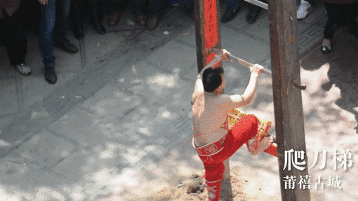 城隍廟的僮身會在元宵時徒手攀上四五層樓高的刀梯,最后坐在最頂端的那條刀刃上,往下方的圍觀群眾拋灑銅錢,賜予祥瑞。蔡國微 攝