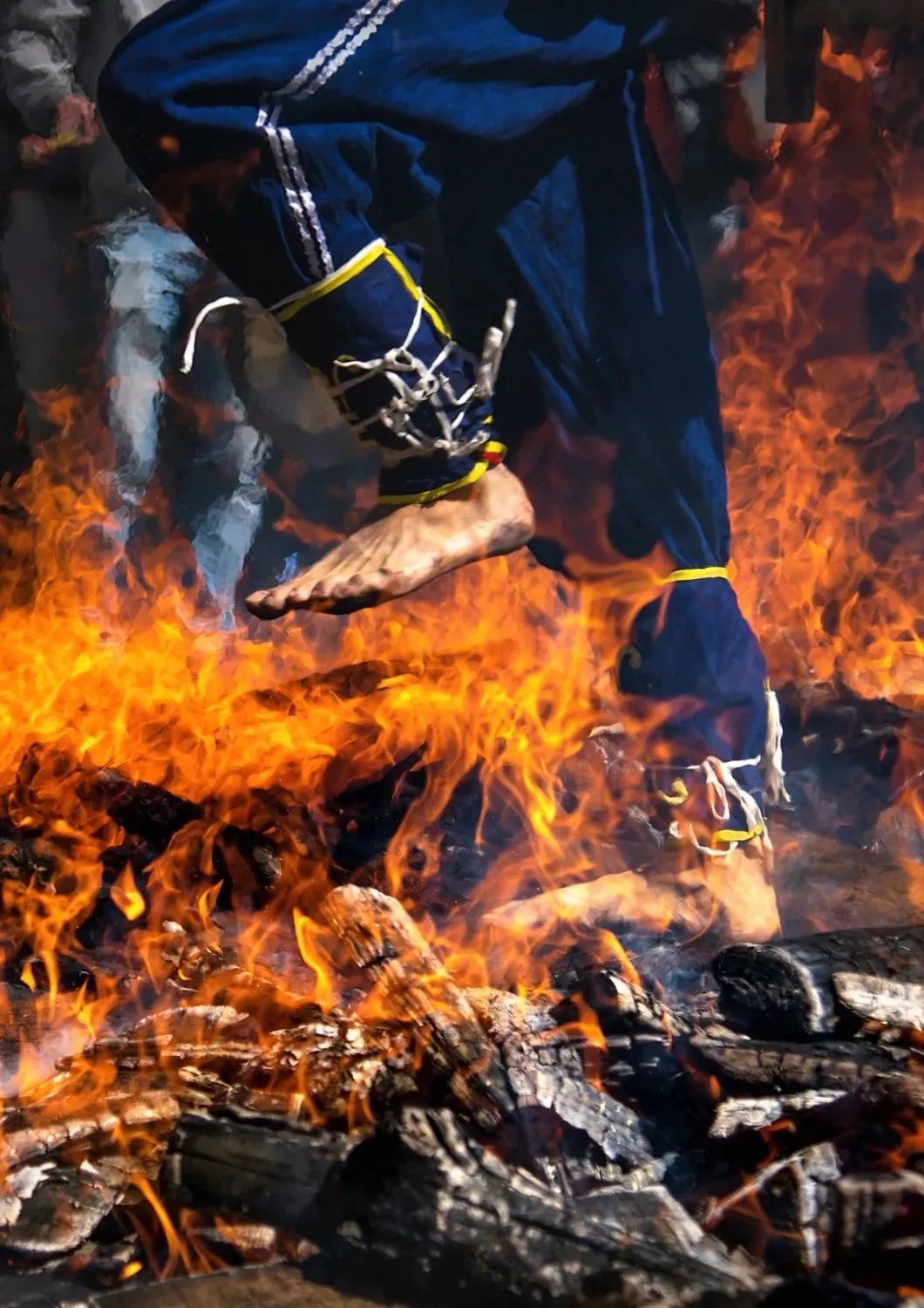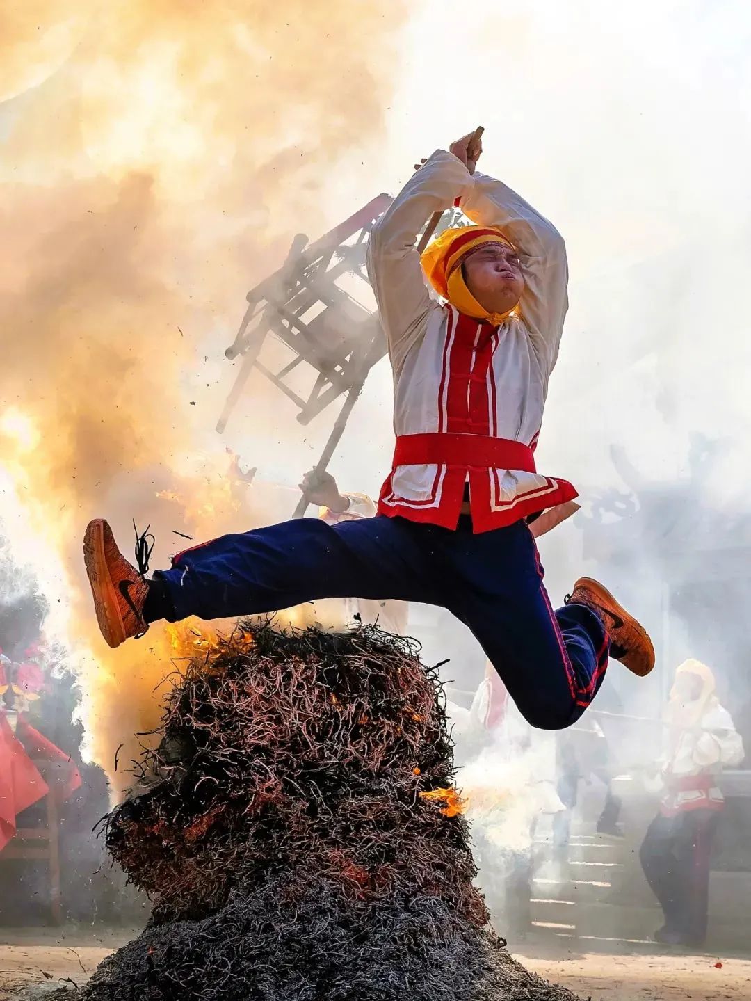 每年正月十七,涵江梧塘松東人在廣場上點(diǎn)燃一人高的柴墻,村里的年輕人會打著赤腳,抬起神轎反復(fù)沖入火海。郭勁瑜 攝