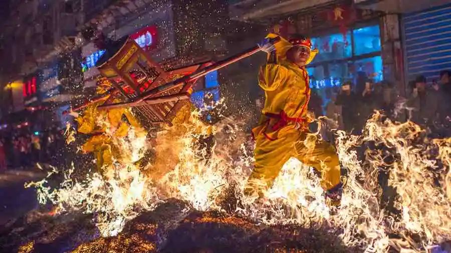 莆田元宵抬神轎跳火堆民俗表演。蔡昊 攝