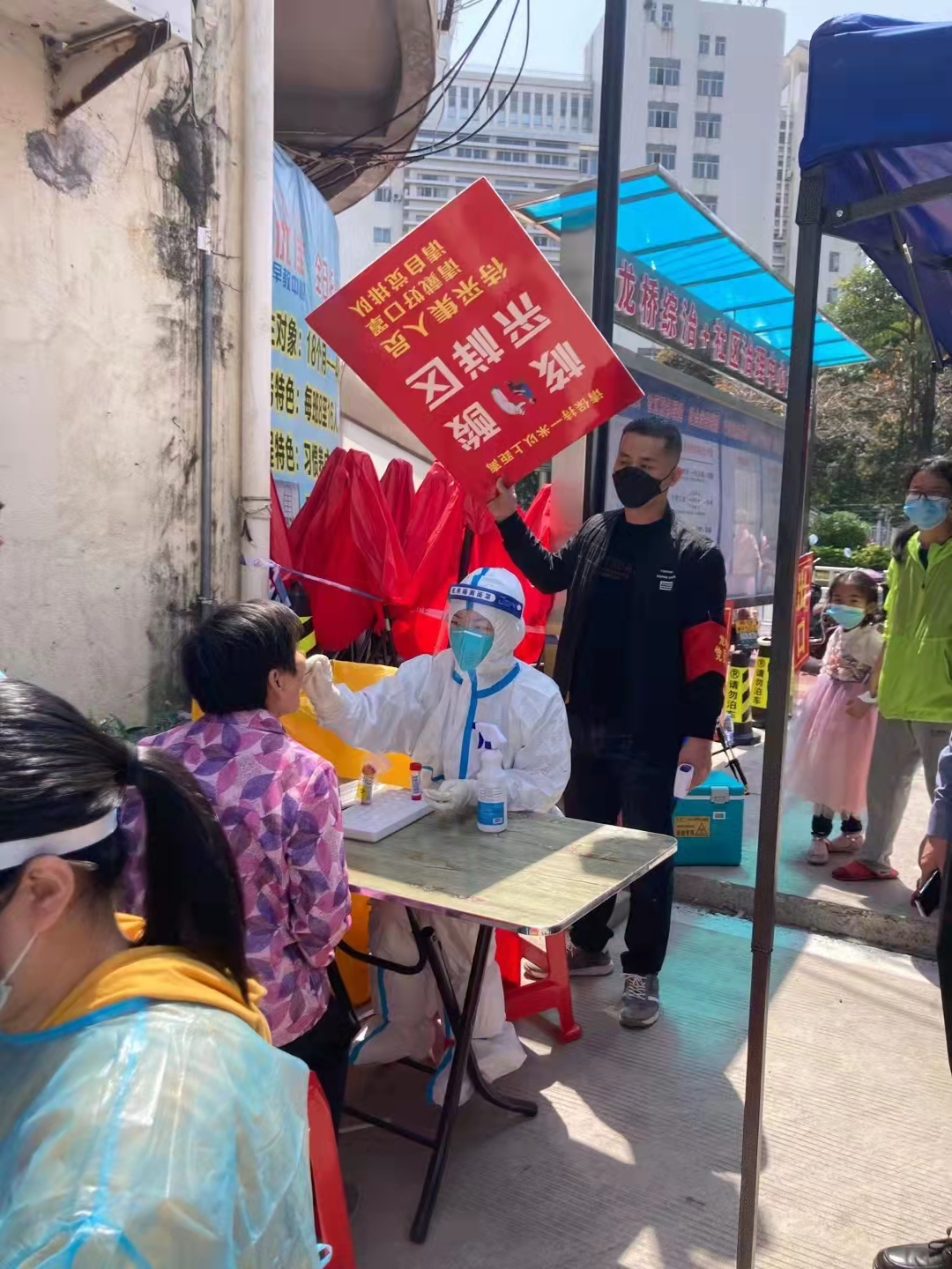 3月19日,在龍橋社區(qū)核酸檢測現(xiàn)場,志愿者為核酸檢測采集醫(yī)務(wù)人員遮擋陽光。