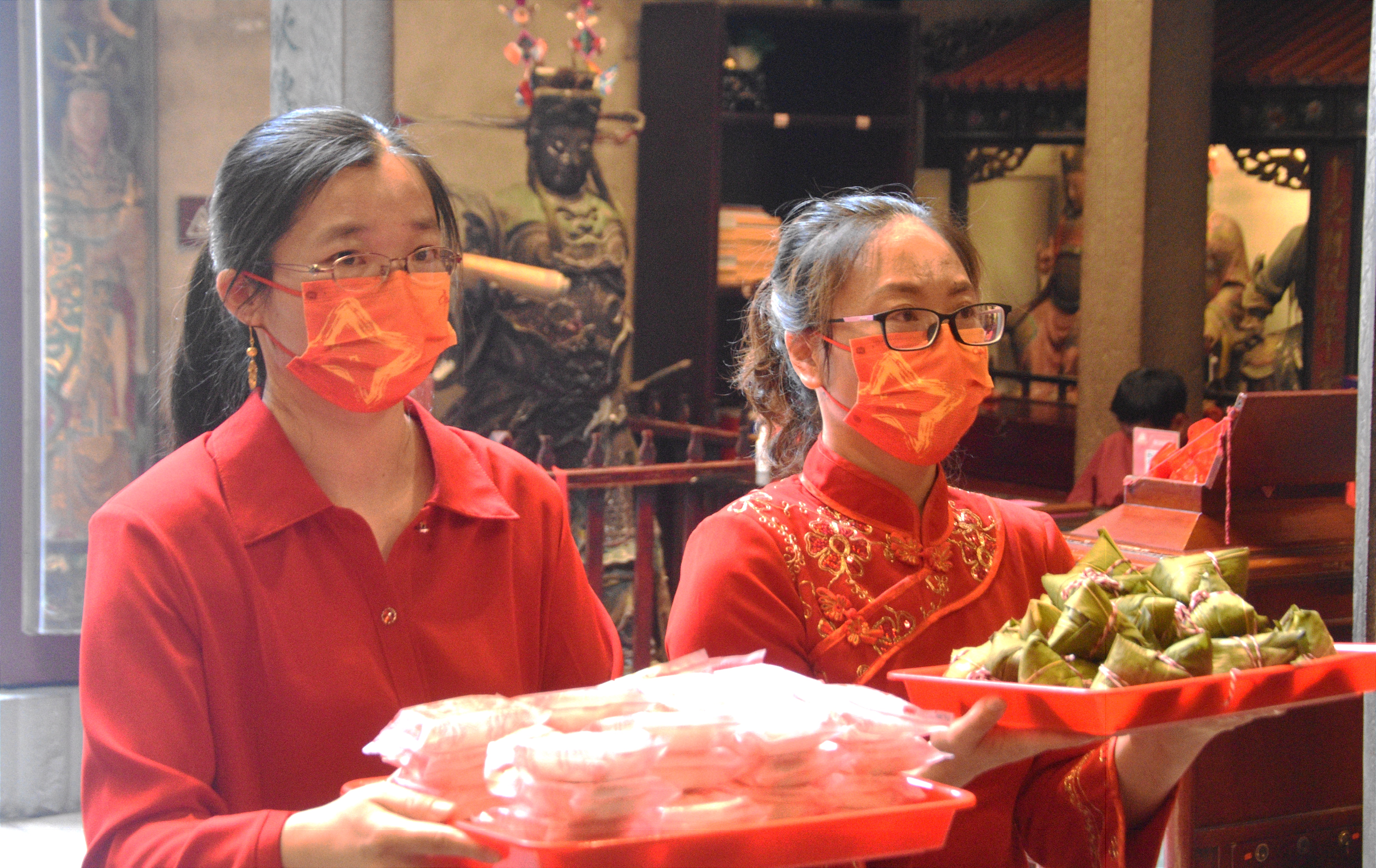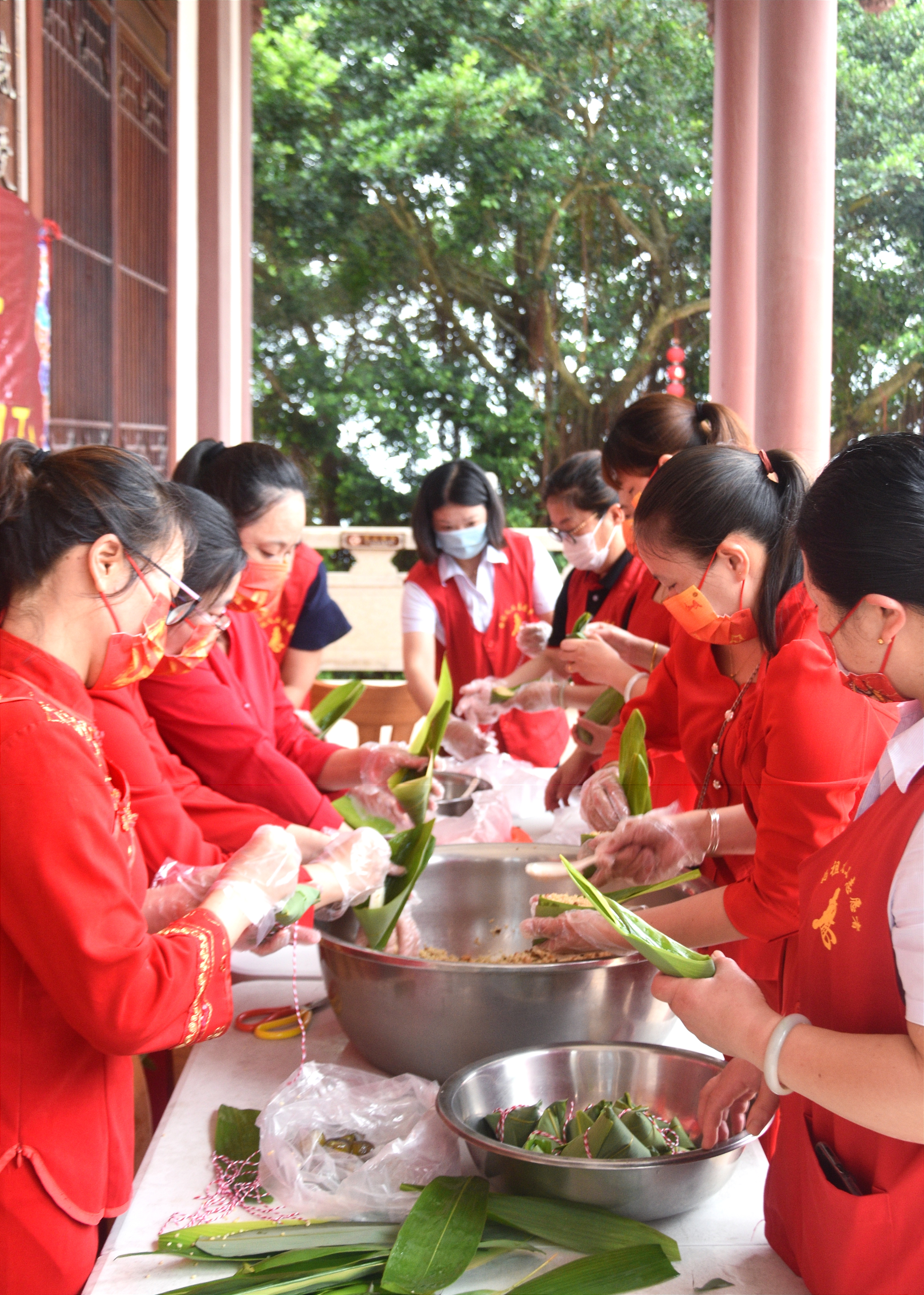 上午8時許,身著紅馬甲的兩岸媽祖義工和莆田媽祖中學(xué)家委會成員齊聚湄洲媽祖祖廟媽祖大學(xué)堂,一起手工制作粽子。捋粽葉、做漏斗、填糯米、封口、扎捆……大家一邊高高興興地包粽子,一邊互相交流包粽子的技巧,忙得不亦樂乎,現(xiàn)場洋溢著濃濃的節(jié)日氣氛。不一會兒,一盆盆新鮮的粽子呈現(xiàn)在眼前,粽葉飄香。