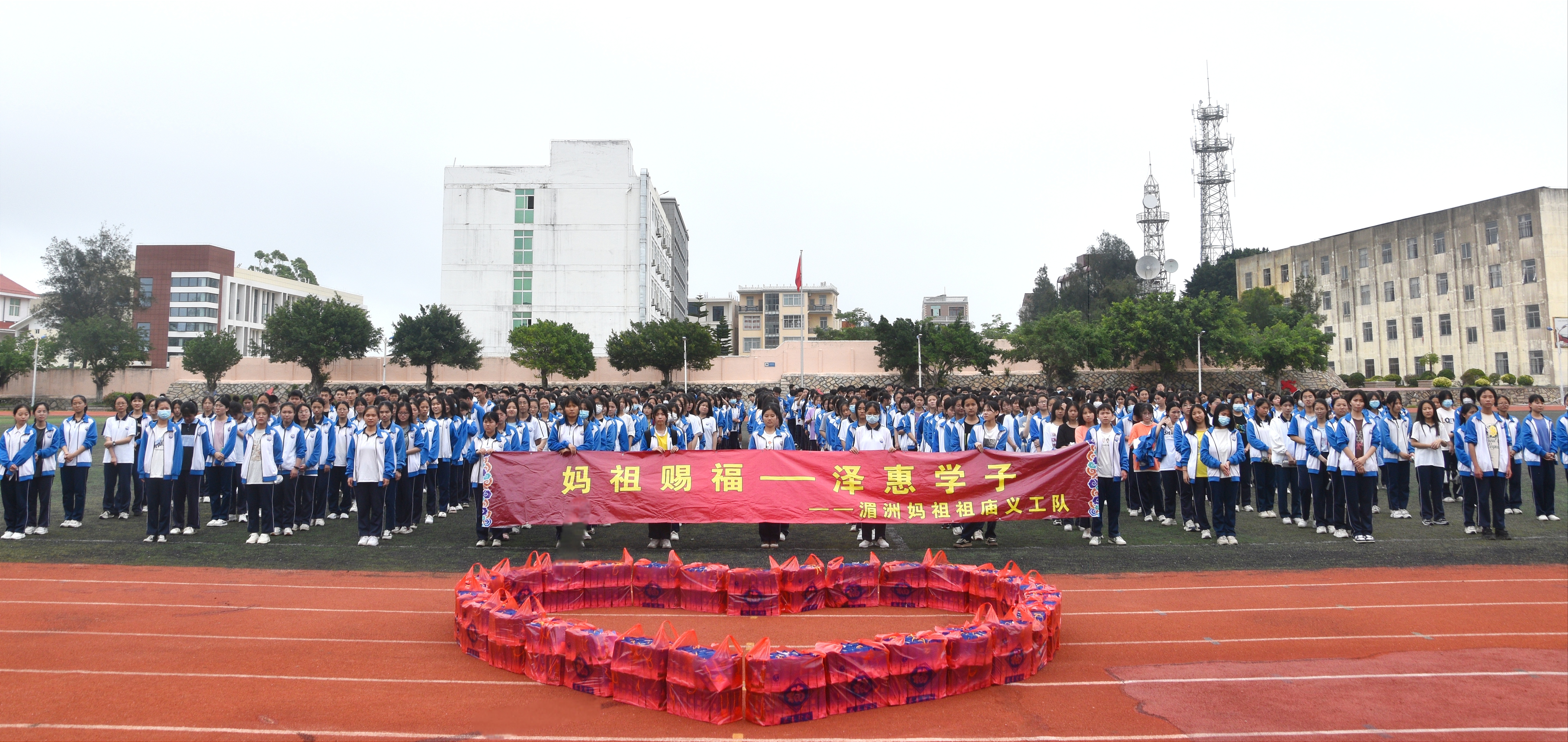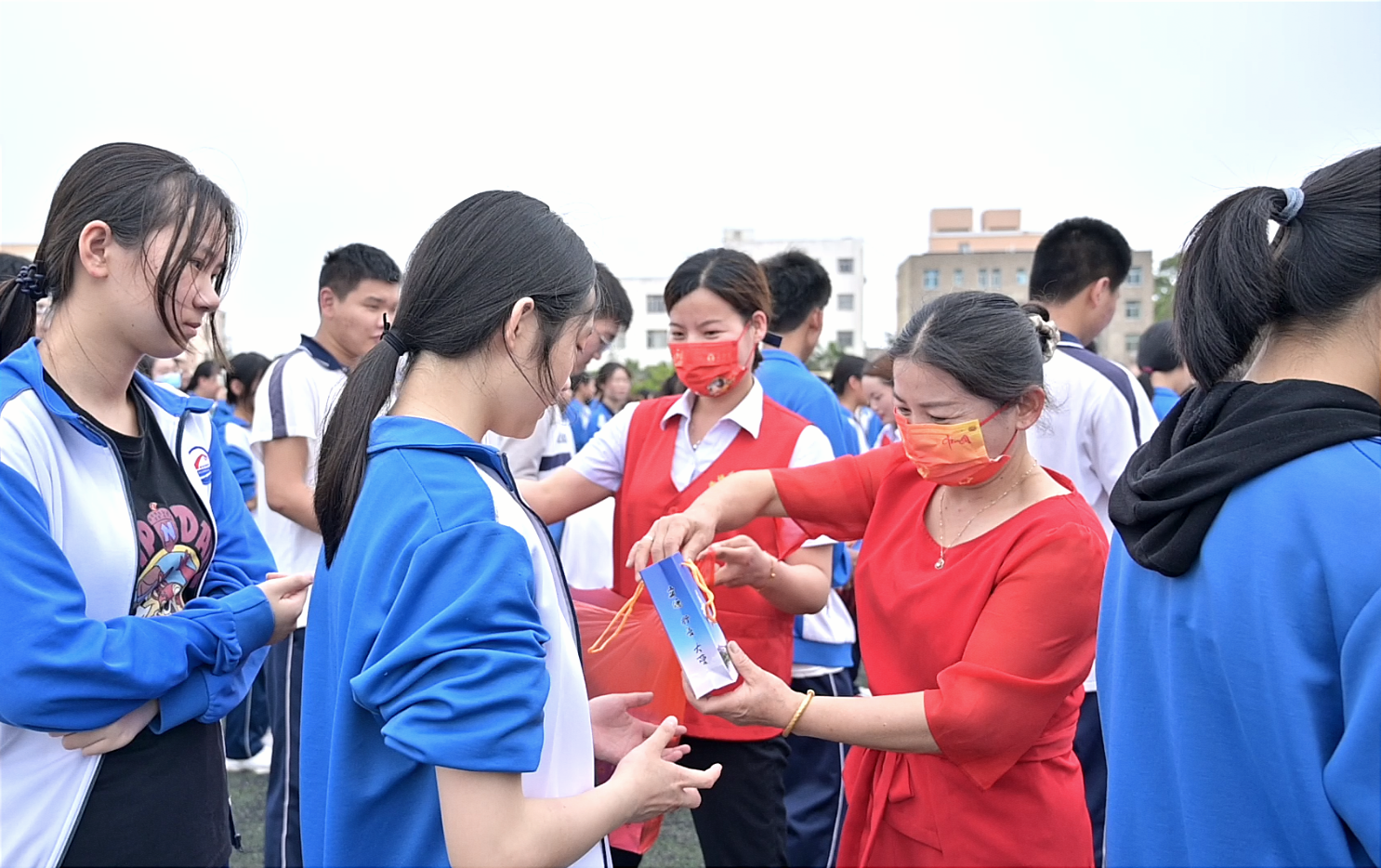下午2時許,兩岸媽祖義工來到媽祖中學(xué)操場,在校家委會成員的協(xié)助下,將裝有一方媽祖糕和一個手工粽子的福袋禮包,一一送到同學(xué)們手中,希望給莘莘學(xué)子在最后的沖刺階段打氣和助威,祝福他們在即將到來的中高考能夠一舉高中,金榜題名。
