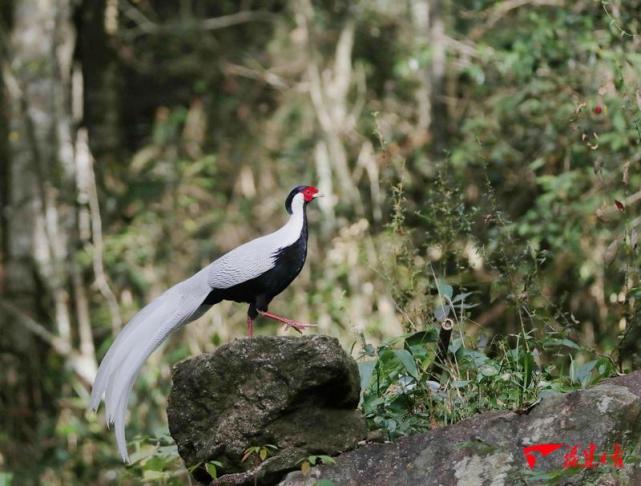 11月18日,在明溪縣夏陽鄉(xiāng)紫云均峰山上,一只白鷴跳到一塊石頭玩耍。(來源:新福建 江月蘭/攝)