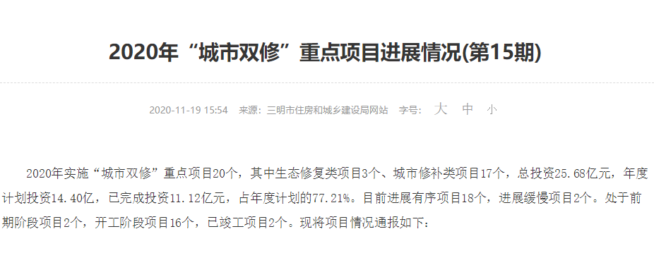 近日,三明市住建局發(fā)布2020年“城市雙修”重點(diǎn)項(xiàng)目進(jìn)展情況(第15期)