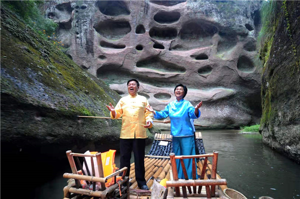 盧德生(左)與搭檔饒桂英在上清溪為游客演唱山歌 泰寧縣融媒體中心供圖