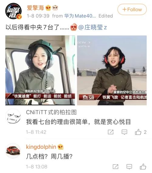 隨著軍事頻道全新改版,相貌出挑又業(yè)務過硬的她,很快進入了軍迷觀眾的視野。