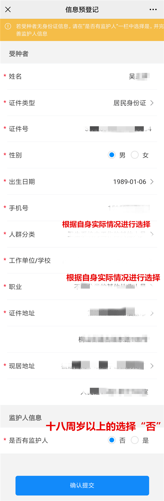 在“信息預(yù)登記“界面,認(rèn)真填寫受種者基本信息,確保姓名、身份證號(hào)碼、聯(lián)系方式準(zhǔn)確無誤。核對(duì)無誤后,點(diǎn)擊“確認(rèn)提交”