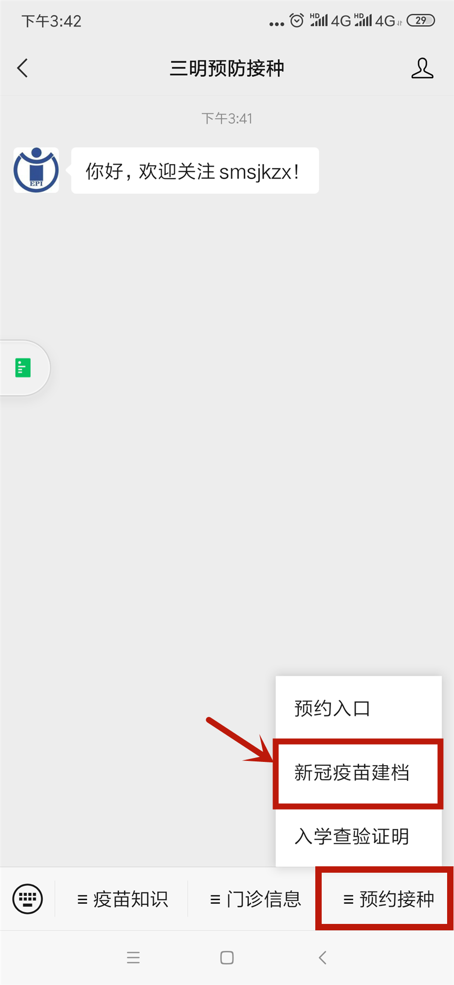 方法1:進(jìn)入公眾號(hào)對(duì)話框后,點(diǎn)擊下方的“預(yù)約接種”菜單,再點(diǎn)擊”新冠疫苗建檔”子菜單