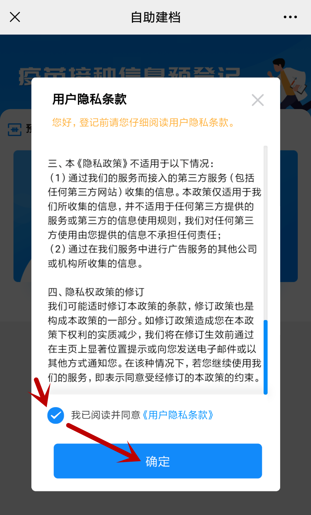 閱讀并同意《用戶隱私條款》后,打“√”并點(diǎn)“確定”