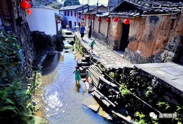 山間的溪流在村中流淌,孩童們戲嬉自樂,好一派世外桃源的景象。