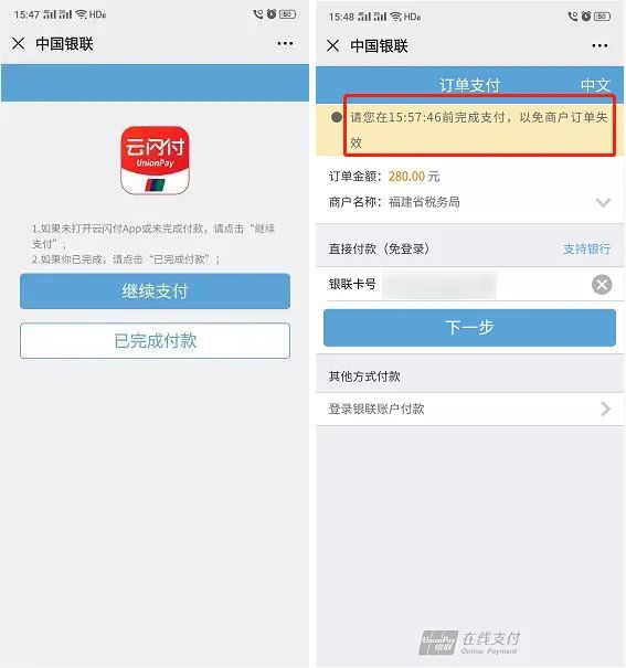 未安裝云閃付APP的銀聯(lián)用戶點(diǎn)擊【繼續(xù)支付】后輸入銀聯(lián)卡號(hào),請(qǐng)?jiān)陧?yè)面提示時(shí)段前完成支付,以免商戶訂單失效。