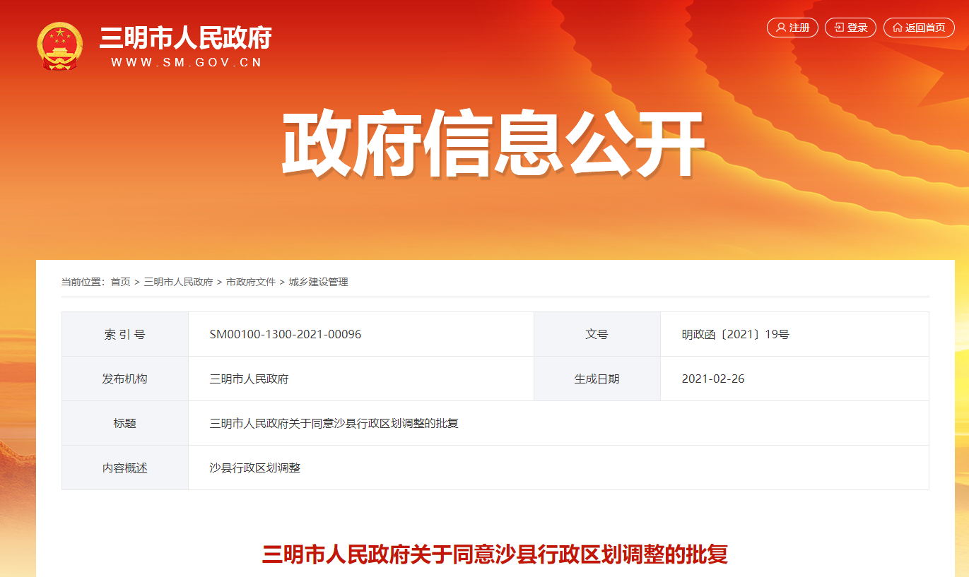 臺海網(wǎng)3月11日訊 據(jù)三明市人民政府網(wǎng)報道 事關(guān)沙縣、梅列區(qū)、三元區(qū)、行政區(qū)調(diào)整!三明市政府10日發(fā)布最新批復(fù)詳情如下——