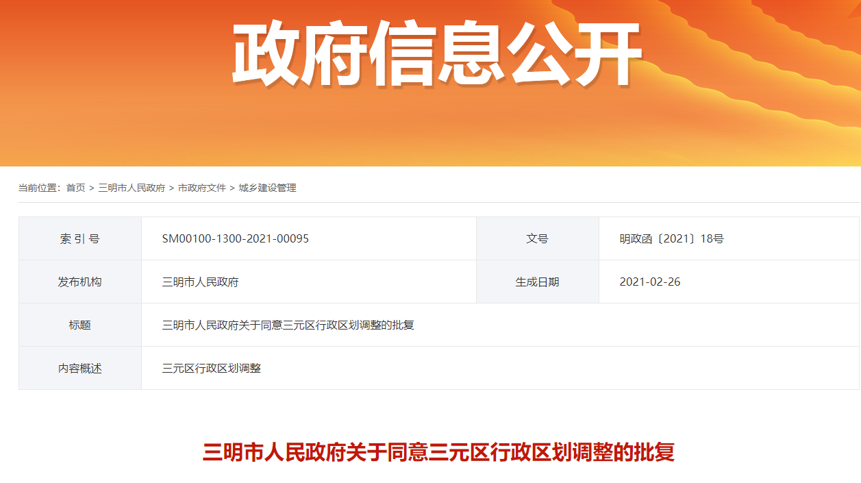 你區(qū)《關(guān)于三元區(qū)行政區(qū)劃調(diào)整的請示》(元政文〔2020〕46號)收悉。經(jīng)報國務(wù)院批準(zhǔn)、福建省人民政府同意,現(xiàn)批復(fù)如下: