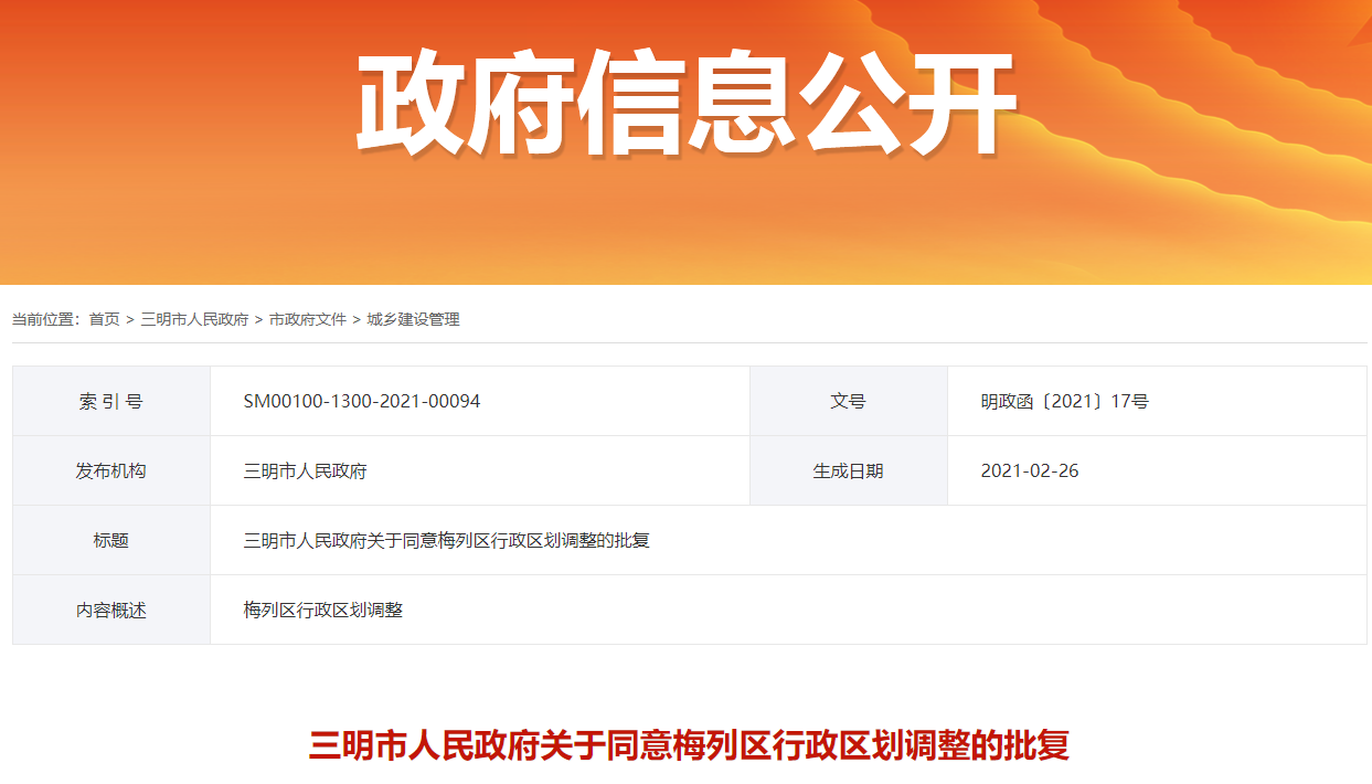 你區(qū)《關(guān)于提請申報梅列區(qū)行政區(qū)劃調(diào)整的請示》(梅政文〔2020〕50號)收悉。經(jīng)報國務(wù)院批準(zhǔn)、福建省人民政府同意,現(xiàn)批復(fù)如下: