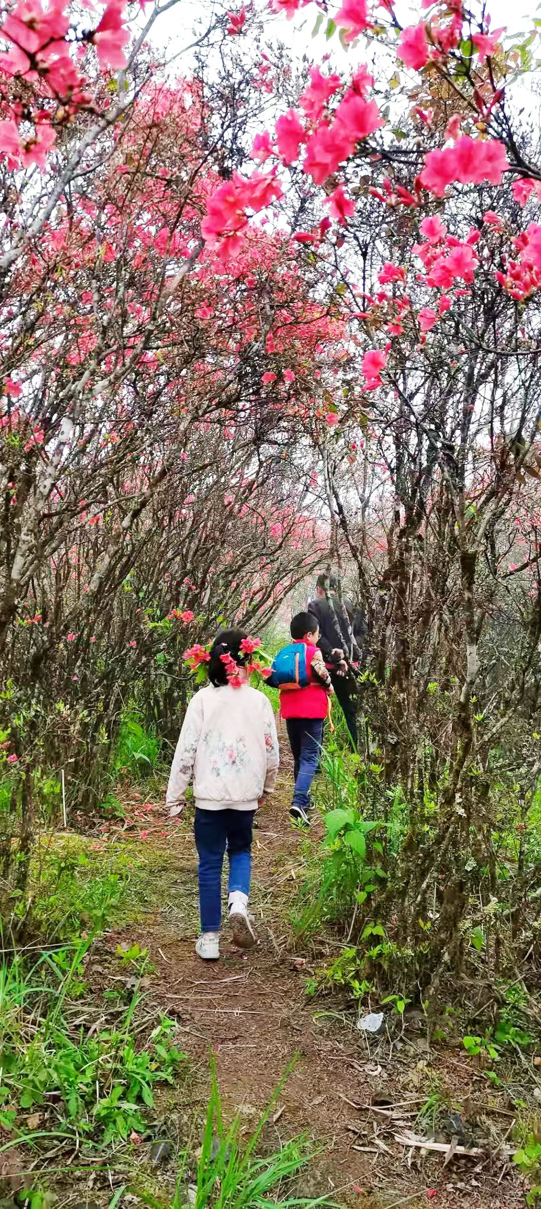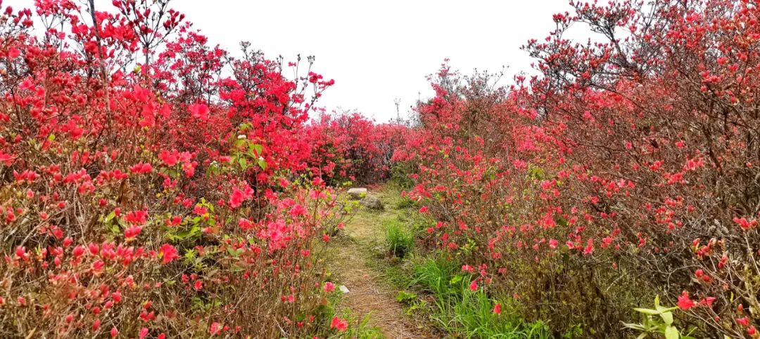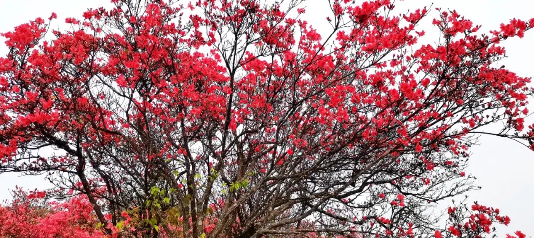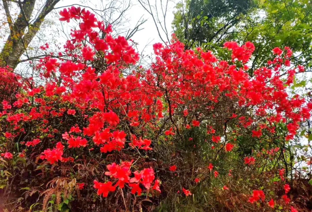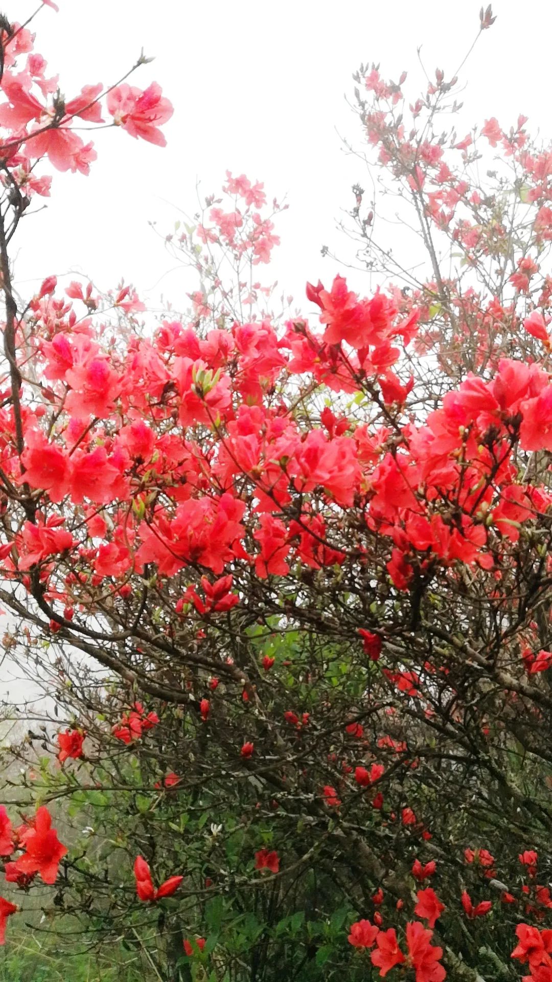 行走山間,藤蘿翠蔓、古木參天,杜鵑婀娜綻放,一叢叢,一簇簇,漫山遍野,高的過人頭,矮的齊腰深,紅得像一片片火焰高聳在山上,盡興飛舞,極為壯觀。