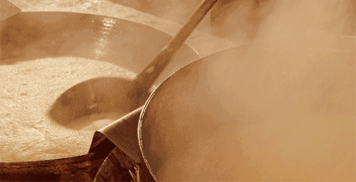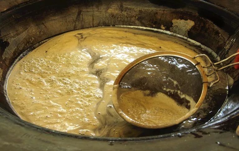 水花。甘蔗汁倒入鍋內(nèi),待汁煮開,鍋內(nèi)的水分和糖分就開始分離,水分隨溫度的升高而漲起很大的水花,水花爆開后就揮發(fā)成水蒸氣。看水花階段需要隔三岔五的攪動,才能讓水分充分揮發(fā)。