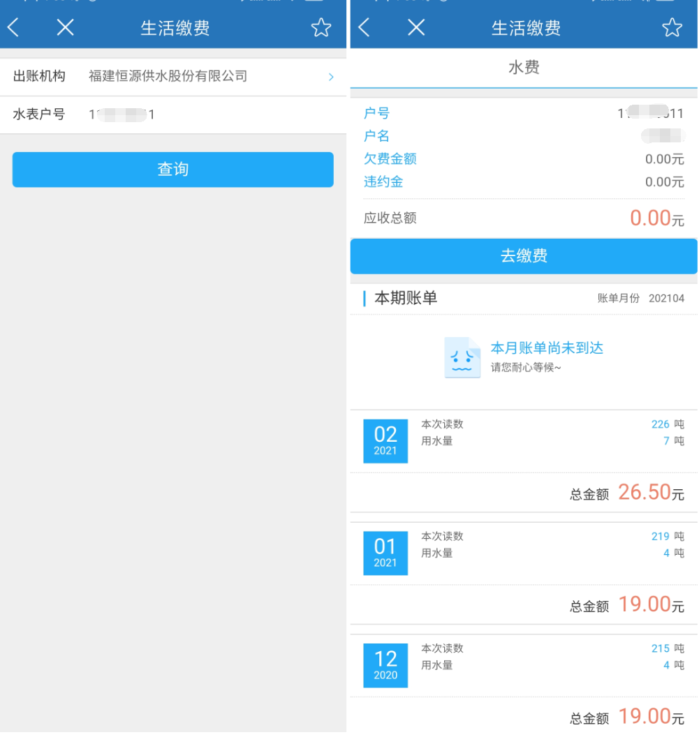 輸入水表戶號即可進行查詢當前賬戶狀態(tài),以及歷史水費賬單。