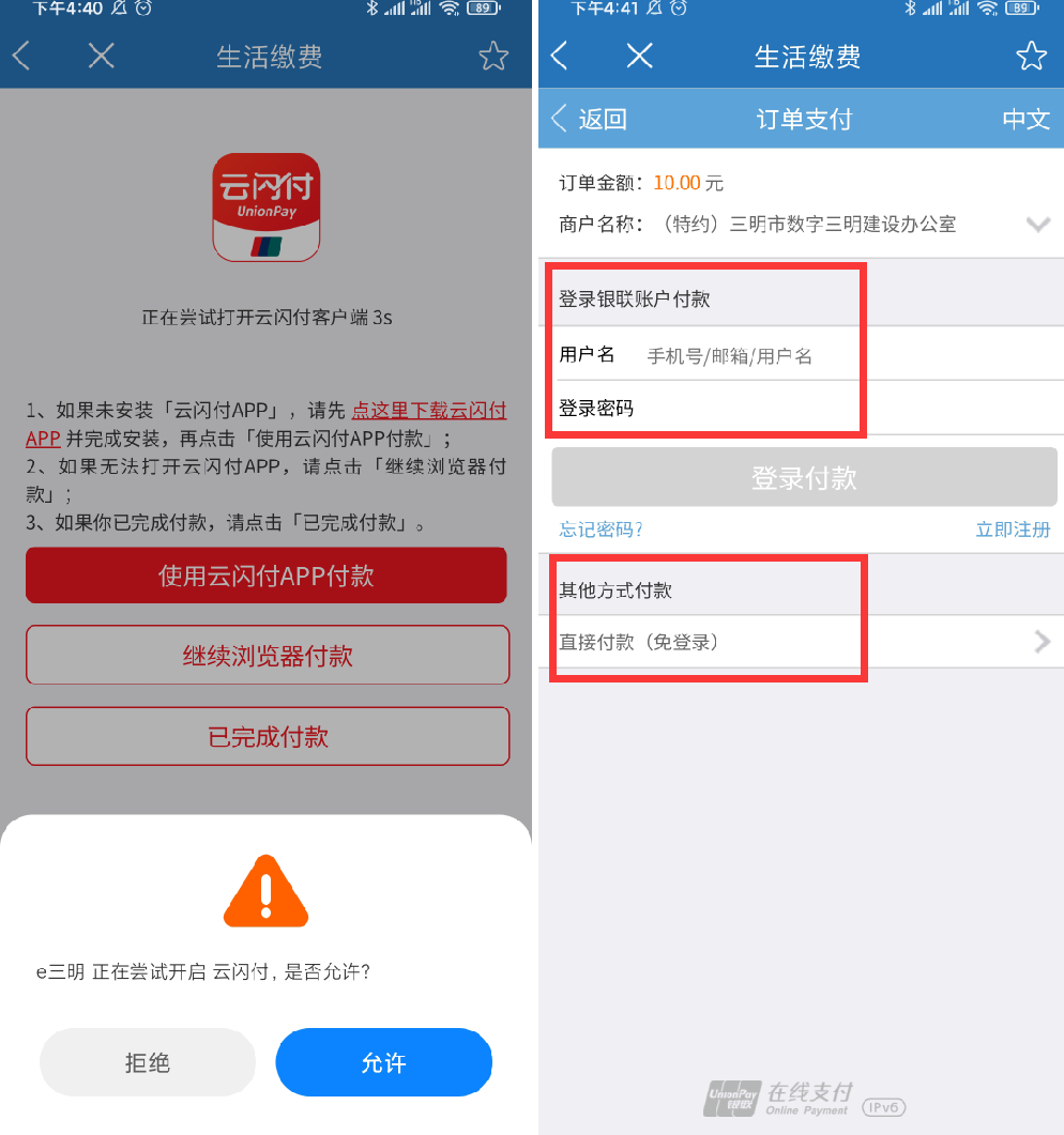 確認繳費金額后,已安裝“云閃付”APP的用戶會直接跳轉云閃付繳費,如未安裝則可直接登錄銀聯(lián)賬戶付款,或使用快捷支付直接付款。