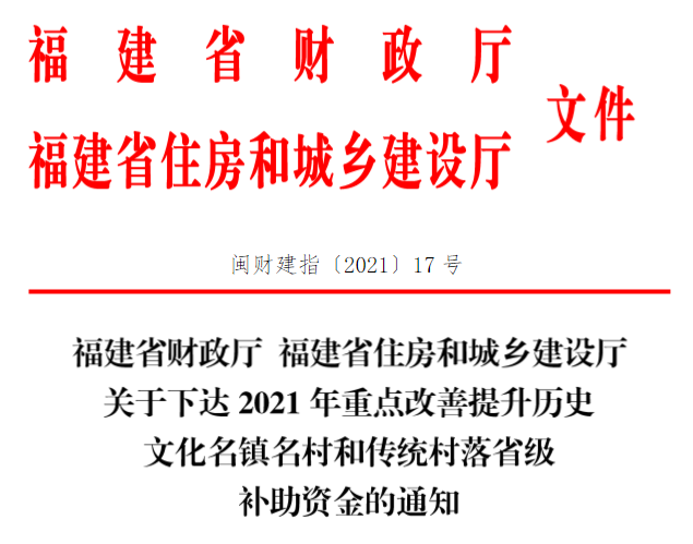 根據(jù)《中共福建省委 福建省人民政府關(guān)于開展2021年為民辦實事工作的通知》《福建省財政廳 福建省住房和城鄉(xiāng)建設(shè)廳關(guān)于印發(fā)的通知》(閩財建〔2020〕3號)等文件要求,現(xiàn)將列入2021年省委和省政府為民辦實事工作計劃的重點改善提升歷史文化名鎮(zhèn)名村和傳統(tǒng)村落省級補助資金下達(dá)給你們,款列“2120201-城鄉(xiāng)社區(qū)規(guī)劃與管理”科目(具體補助對象及金額詳見附件1)。有關(guān)事項要求如下: