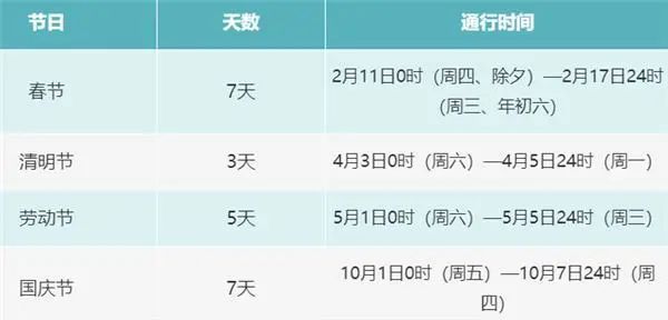 根據(jù)《重大節(jié)假日免收小型客車通行費實施方案》,收費公路免費通行時間為春節(jié)、清明節(jié)、勞動節(jié)、國慶節(jié),共4個國家法定節(jié)假日以及國務院辦公廳文件確定的上述法定節(jié)假日連休日。