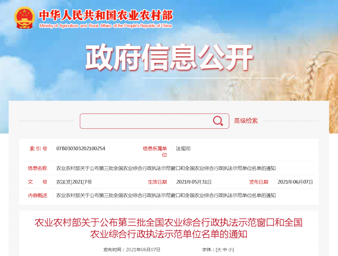 農(nóng)業(yè)農(nóng)村部關(guān)于公布第三批全國農(nóng)業(yè)綜合行政執(zhí)法示范窗口和全國農(nóng)業(yè)綜合行政執(zhí)法示范單位名單的通知
